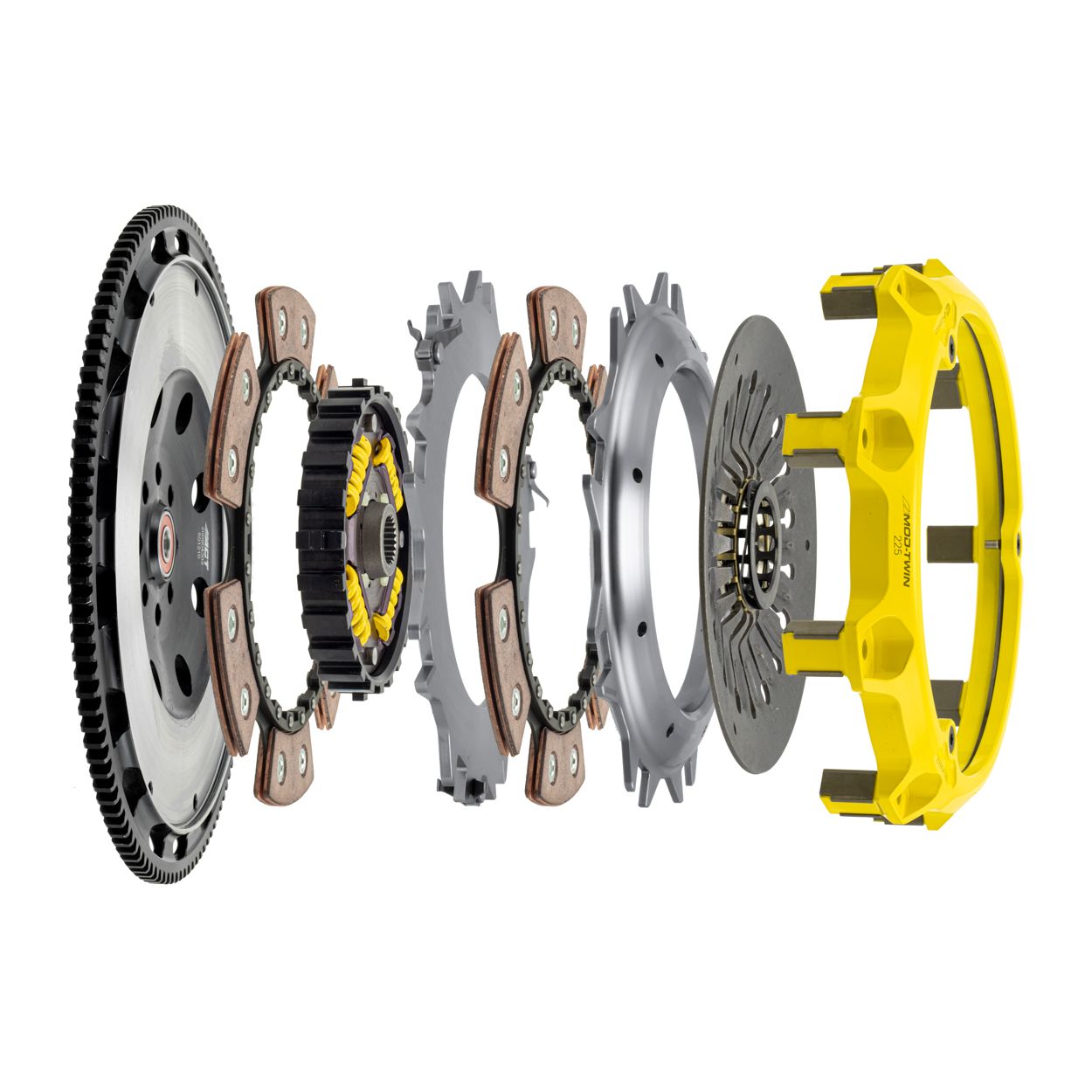 T2R-S05 Mod-Twin 225 XT Sprung Race Kit performs aggressive launches and smoother shifting in high powered AWD’s by combining twice the ceramic friction surfaces with an ultra-durable Mono-Drive sprung hub assembly in a completely modular design. Each diaphragm spring endures an exclusive four-stage heat treating process providing a consistent light pedal feel. Puck-style Friction Plates with high quality ceramic friction materials deliver high friction coefficient, superior heat capacity, and long clutch life. These Friction Plates uniformly transfer torque to a Mono-Drive sprung hub assembly which extends input shaft life and reduces driveline shock from torsional vibration. This kit includes a CNC-machined and dynamically balanced flywheel, pressure plate cover, diaphragm spring, face, puck-style ceramic friction plates, sprung Mono-Drive hub assembly, floater, patented Monoloc Collar, release bearing, alignment tool and pilot bearing (if needed). Mod-Twin clutches are fully rebuildable and most components can be ordered separately.