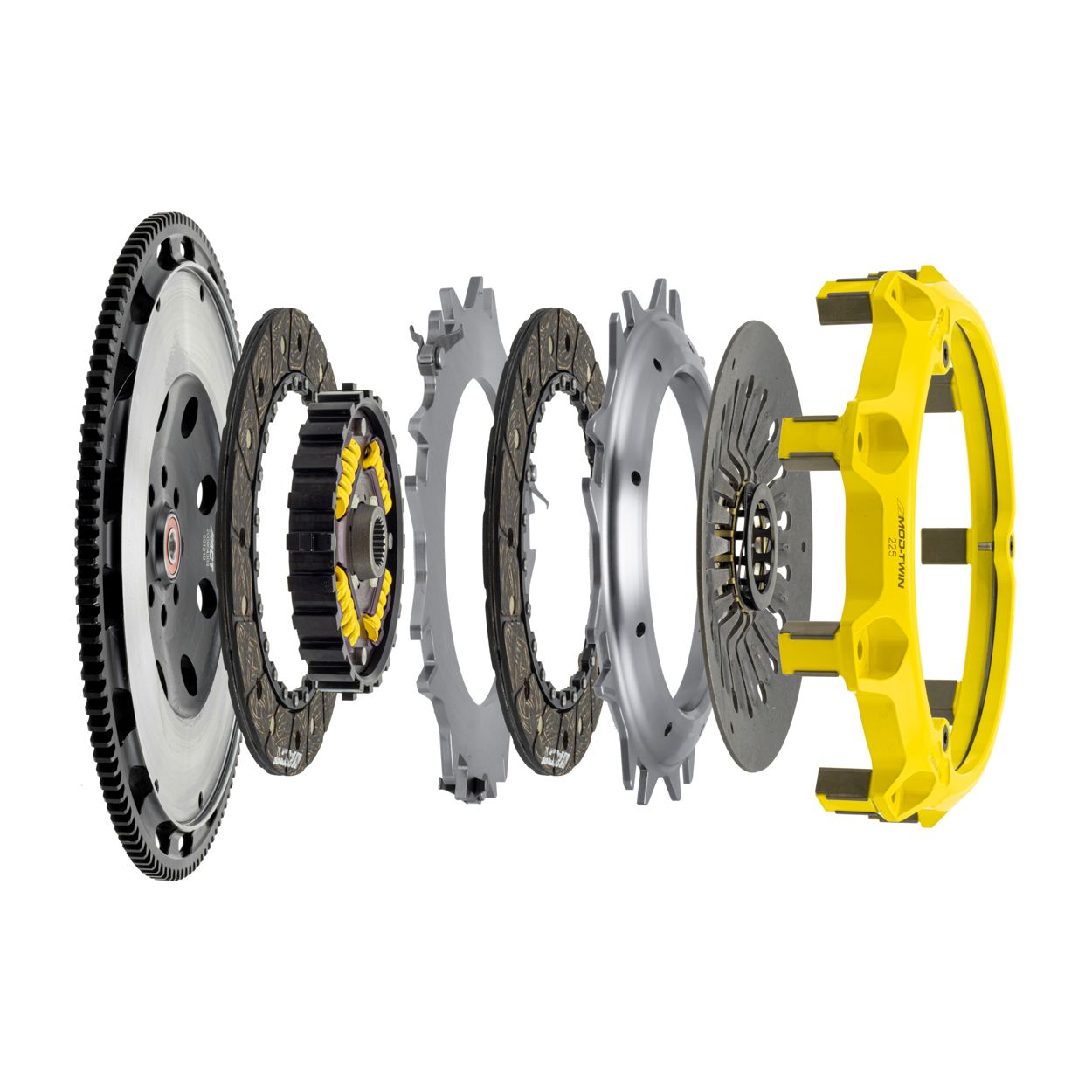 T2S-S05 Mod-Twin 225 HD Sprung Street Kit is designed for high powered AWD street cars. It unites uncompromised pedal feel, durability, engagement quality with very high torque capacity by combining twice the organic friction surfaces with an ultra-durable spring center Mono-Drive hub in a completely modular design. Each diaphragm spring endures an exclusive four-stage heat treating process providing a consistent light pedal feel. Steel-backed Friction Plates with high quality organic friction materials deliver stable friction coefficient, good heat capacity and long clutch life. These Friction Plates uniformly transfer torque to the Mono-Drive sprung hub assembly which extends input shaft life and reduces driveline shock from torsional vibration. This kit includes a CNC-machined and dynamically balanced flywheel, pressure plate cover, diaphragm spring, face, puck-style ceramic friction plates, sprung Mono-Drive hub assembly, floater, patented Monoloc Collar, release bearing, alignment tool and pilot bearing (if needed). Mod-Twin clutches are fully rebuildable and most components can be ordered separately.