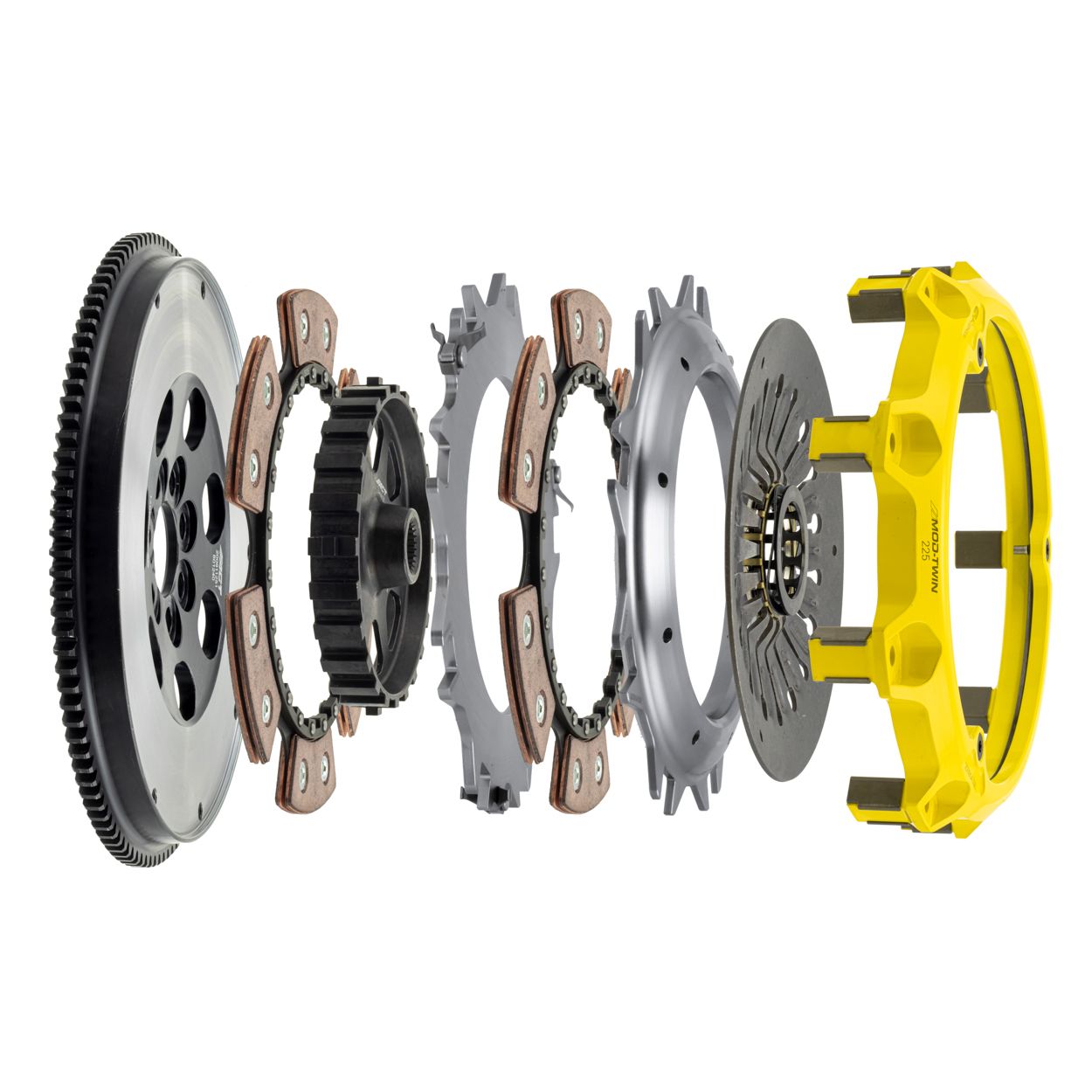T3R-M07 Mod-Twin 225 XX Rigid Race Kit tackles aggressive launches and rapid shifting of high powered AWD’s by combining twice the ceramic friction surfaces with a no-nonsense solid Mono-Drive hub in a completely modular design. Each diaphragm spring endures an exclusive four-stage heat treating process providing a consistent pedal feel requiring moderate effort. Puck-style Friction Plates with high quality ceramic friction materials deliver high friction coefficient, superior heat capacity, and long clutch life. These Friction Plates uniformly transfer torque to a Mono-Drive chrome-moly hub which is heat treated for strength and durability extending input shaft life with one continuous spline. The lightweight, rigid design allows for quicker shifts and trouble-free service. This kit includes a CNC-machined and dynamically balanced flywheel, pressure plate cover, diaphragm spring, face, puck-style ceramic friction plates, rigid Mono-Drive hub, floater, patented Monoloc Collar, release bearing, alignment tool and pilot bearing (if needed). Mod-Twin clutches are fully rebuildable and most components can be ordered separately.