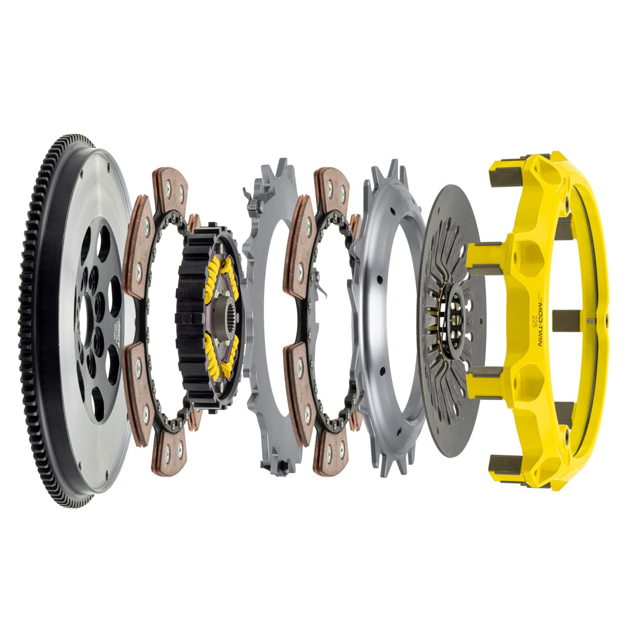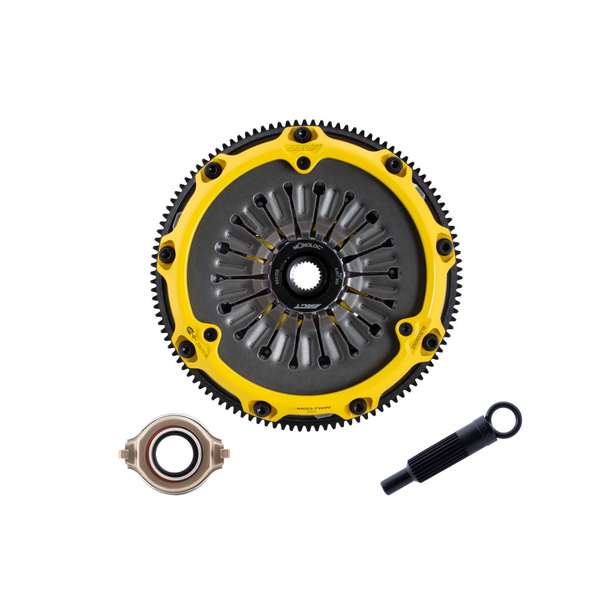 T3R-M05 Mod-Twin 225 XX Sprung Race Kit performs aggressive launches and smoother shifting in high powered AWD’s by combining twice the ceramic friction surfaces with an ultra-durable Mono-Drive sprung hub assembly in a completely modular design. Each diaphragm spring endures an exclusive four-stage heat treating process providing a consistent pedal feel requiring moderate effort. Puck-style Friction Plates with high quality ceramic friction materials deliver high friction coefficient, superior heat capacity, and long clutch life. These Friction Plates uniformly transfer torque to a Mono-Drive sprung hub assembly which extends input shaft life and reduces driveline shock from torsional vibration. This kit includes a CNC-machined and dynamically balanced flywheel, pressure plate cover, diaphragm spring, face, puck-style ceramic friction plates, sprung Mono-Drive hub assembly, floater, patented Monoloc Collar, release bearing, alignment tool and pilot bearing (if needed). Mod-Twin clutches are fully rebuildable and most components can be ordered separately.
