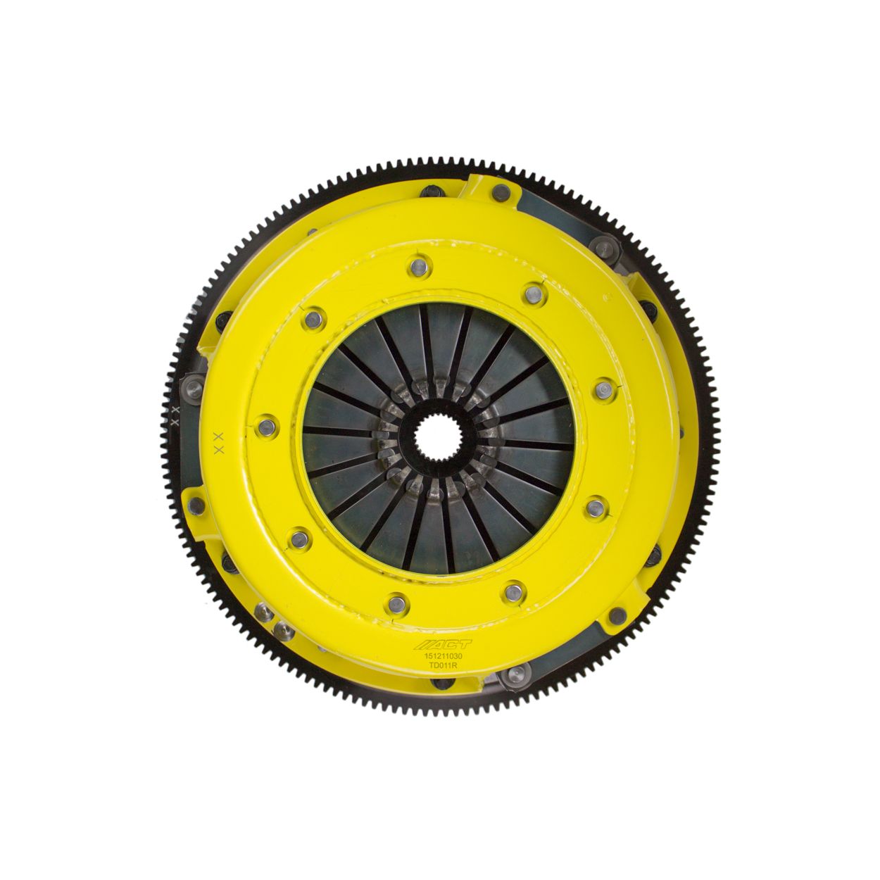T1R-G05 twin disc kit offers twice the number of disc surfaces for better wear, heat capacity and long life compared to single disc kits. These kits use a proprietary Positive Lift Floater System design, which results in quiet operation with no floater rattle and no posts to wear. ACT twin disc kits endure an exclusive four-stage, heat treating process performed on all diaphragms. The ACT twin disc features the ability to adjust for disc wear and provides equal disengagement for discs. ACT's 6-pad rigid race discs are made with high quality, ceramic friction materials. The chrome-moly hub is heat-treated for strength and durability. The lightweight, rigid design allows for quicker shifts and trouble-free service. All ACT twin disc kits include a CNC-machined and dynamically balanced flywheel to ensure trouble-free installation and operation. ACT twin disc kits include a pressure plate, two discs, a floater, flywheel and alignment tool. Some kits may include a pilot bearing and release bearing.