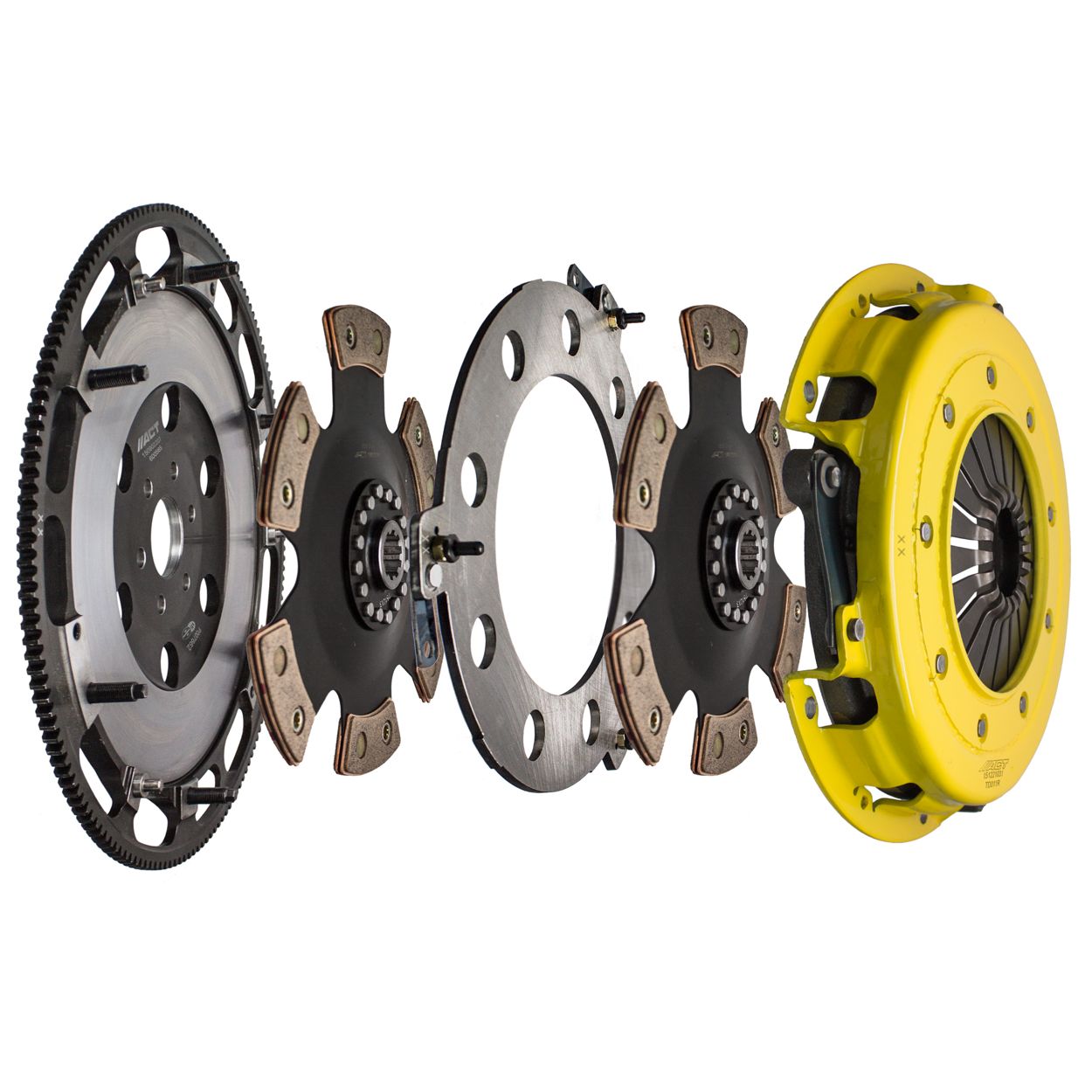 T1R-F02 twin disc kit offers twice the number of disc surfaces for better wear, heat capacity and long life compared to single disc kits. These kits use a proprietary Positive Lift Floater System design, which results in quiet operation with no floater rattle and no posts to wear. ACT twin disc kits endure an exclusive four-stage, heat treating process performed on all diaphragms. The ACT twin disc features the ability to adjust for disc wear and provides equal disengagement for discs. ACT's 6-pad rigid race discs are made with high quality, ceramic friction materials. The chrome-moly hub is heat-treated for strength and durability. The lightweight, rigid design allows for quicker shifts and trouble-free service. All ACT twin disc kits include a CNC-machined and dynamically balanced flywheel to ensure trouble-free installation and operation. ACT twin disc kits include a pressure plate, two discs, a floater, flywheel and alignment tool. Some kits may include a pilot bearing and release bearing.