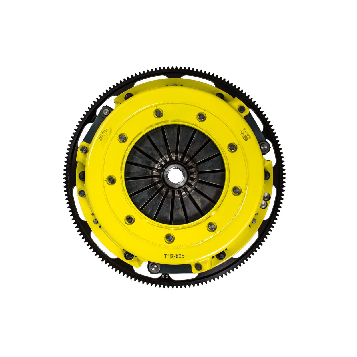 T1R-F05 twin disc kit offers twice the number of disc surfaces for better wear, heat capacity and long life compared to single disc kits. These kits use a proprietary Positive Lift Floater System design, which results in quiet operation with no floater rattle and no posts to wear. ACT twin disc kits endure an exclusive four-stage, heat treating process performed on all diaphragms. The ACT twin disc features the ability to adjust for disc wear and provides equal disengagement for discs. ACT's 6-pad rigid race discs are made with high quality, ceramic friction materials. The chrome-moly hub is heat-treated for strength and durability. The lightweight, rigid design allows for quicker shifts and trouble-free service. All ACT twin disc kits include a CNC-machined and dynamically balanced flywheel to ensure trouble-free installation and operation. ACT twin disc kits include a pressure plate, two discs, a floater, flywheel and alignment tool. Some kits may include a pilot bearing and release bearing.