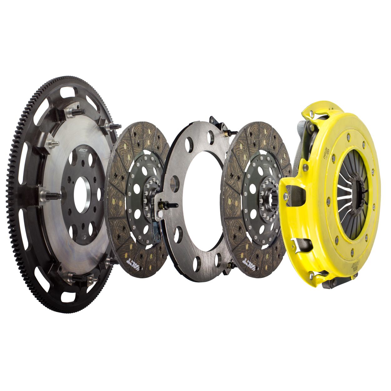 T3R-F09 race, twin disc kit offers twice the number of disc surfaces for better wear, heat capacity and long life compared to single disc kits. These kits use a proprietary Positive Lift Floater System design, which results in quiet operation with no floater rattle and no posts to wear. ACT twin disc kits undergo an exclusive four-stage, heat-treating process on all diaphragms. The ACT twin disc features the ability to adjust for disc wear and provides equal disengagement for discs. ACT's 6-pad rigid race discs are made with high quality, ceramic friction materials. The chrome-moly hub is heat-treated for strength and durability. The lightweight, rigid design allows for quicker shifts and trouble-free service. All ACT twin disc kits include a CNC-machined and dynamically balanced flywheel to ensure trouble-free installation and operation. ACT twin disc kits include a pressure plate, two discs, a floater, flywheel and alignment tool. Some kits may include a pilot bearing and release bearing.