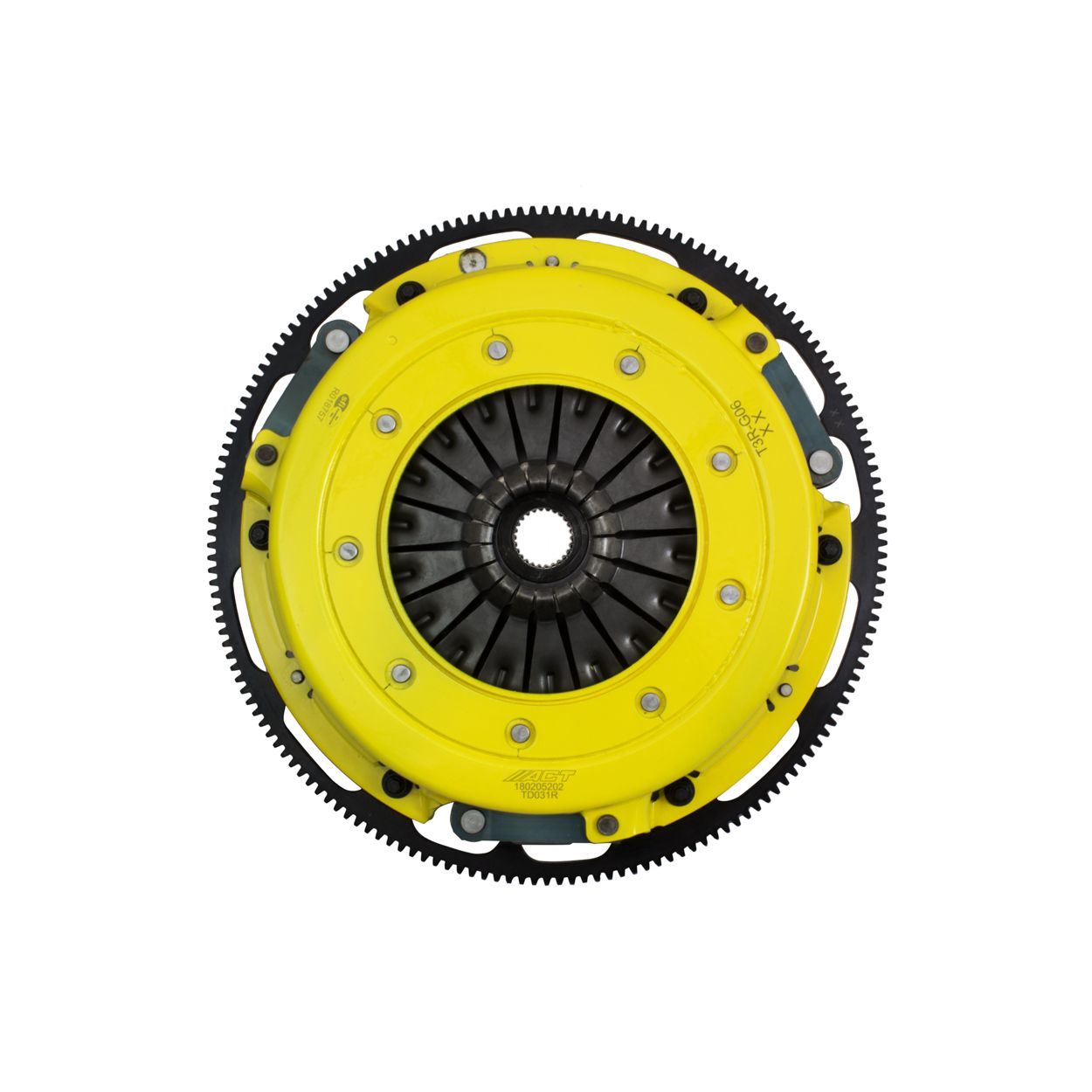 T3R-G06 race, twin disc kit offers twice the number of disc surfaces for better wear, heat capacity and long life compared to single disc kits. These kits use a proprietary Positive Lift Floater System design, which results in quiet operation with no floater rattle and no posts to wear. ACT twin disc kits undergo an exclusive four-stage, heat-treating process on all diaphragms. The ACT twin disc features the ability to adjust for disc wear and provides equal disengagement for discs. ACT's 6-pad rigid race discs are made with high quality, ceramic friction materials. The chrome-moly hub is heat-treated for strength and durability. The lightweight, rigid design allows for quicker shifts and trouble-free service. All ACT twin disc kits include a CNC-machined and dynamically balanced flywheel to ensure trouble-free installation and operation. ACT twin disc kits include a pressure plate, two discs, a floater, flywheel and alignment tool. Some kits may include a pilot bearing and release bearing.