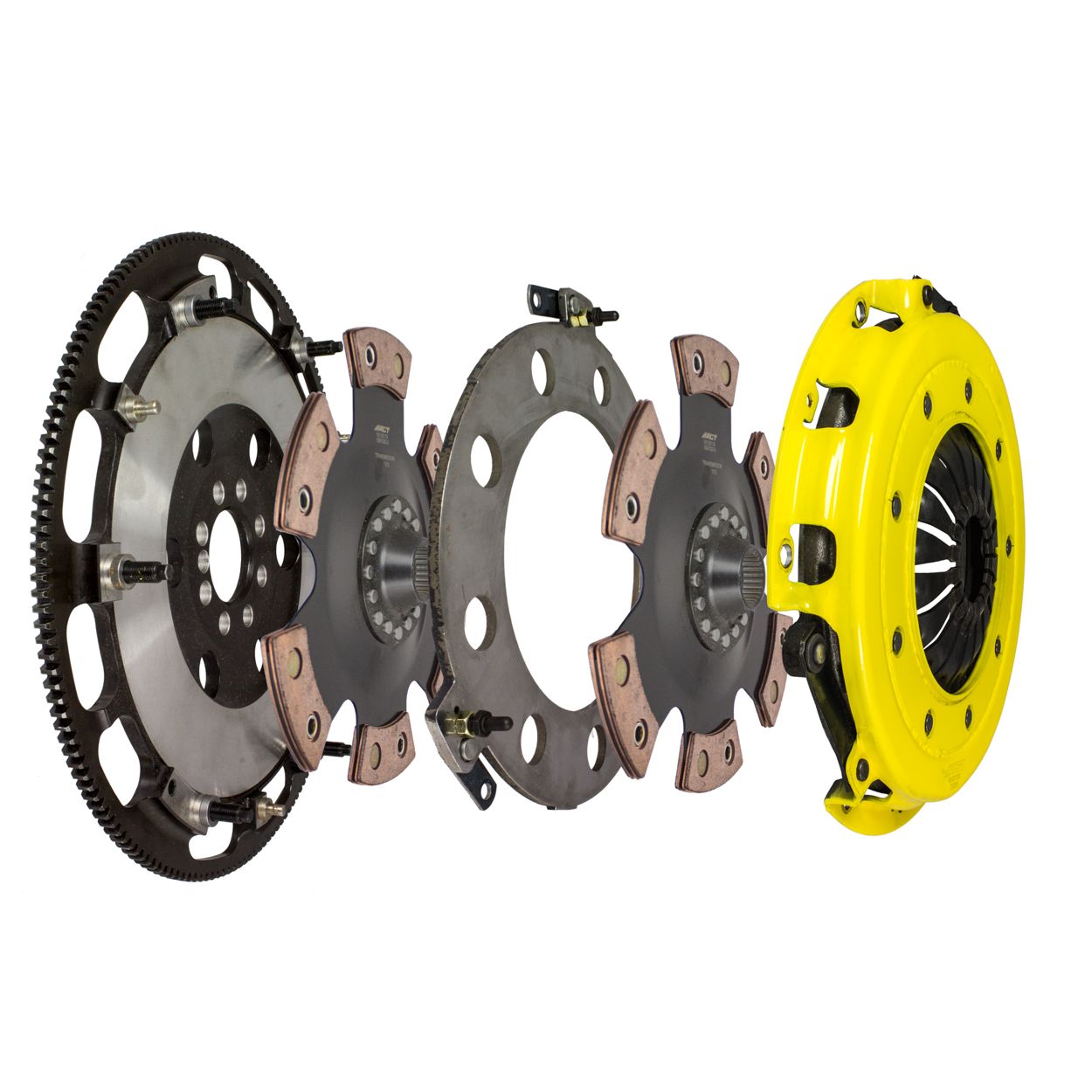T3R-G09 race, twin disc kit offers twice the number of disc surfaces for better wear, heat capacity and long life compared to single disc kits. These kits use a proprietary Positive Lift Floater System design, which results in quiet operation with no floater rattle and no posts to wear. ACT twin disc kits undergo an exclusive four-stage, heat-treating process on all diaphragms. The ACT twin disc features the ability to adjust for disc wear and provides equal disengagement for discs. ACT's 6-pad rigid race discs are made with high quality, ceramic friction materials. The chrome-moly hub is heat-treated for strength and durability. The lightweight, rigid design allows for quicker shifts and trouble-free service. All ACT twin disc kits include a CNC-machined and dynamically balanced flywheel to ensure trouble-free installation and operation. ACT twin disc kits include a pressure plate, two discs, a floater, flywheel and alignment tool. Some kits may include a pilot bearing and release bearing.