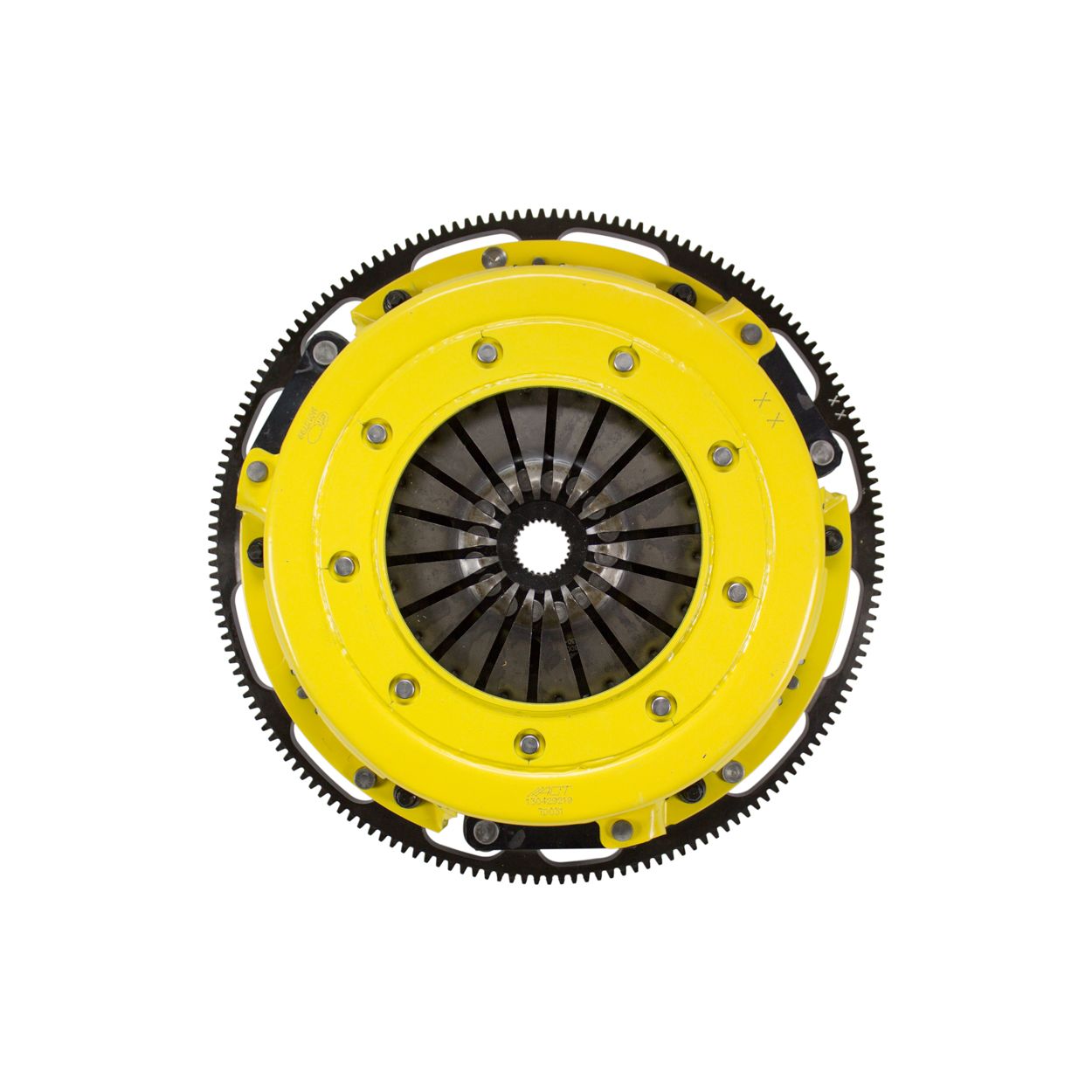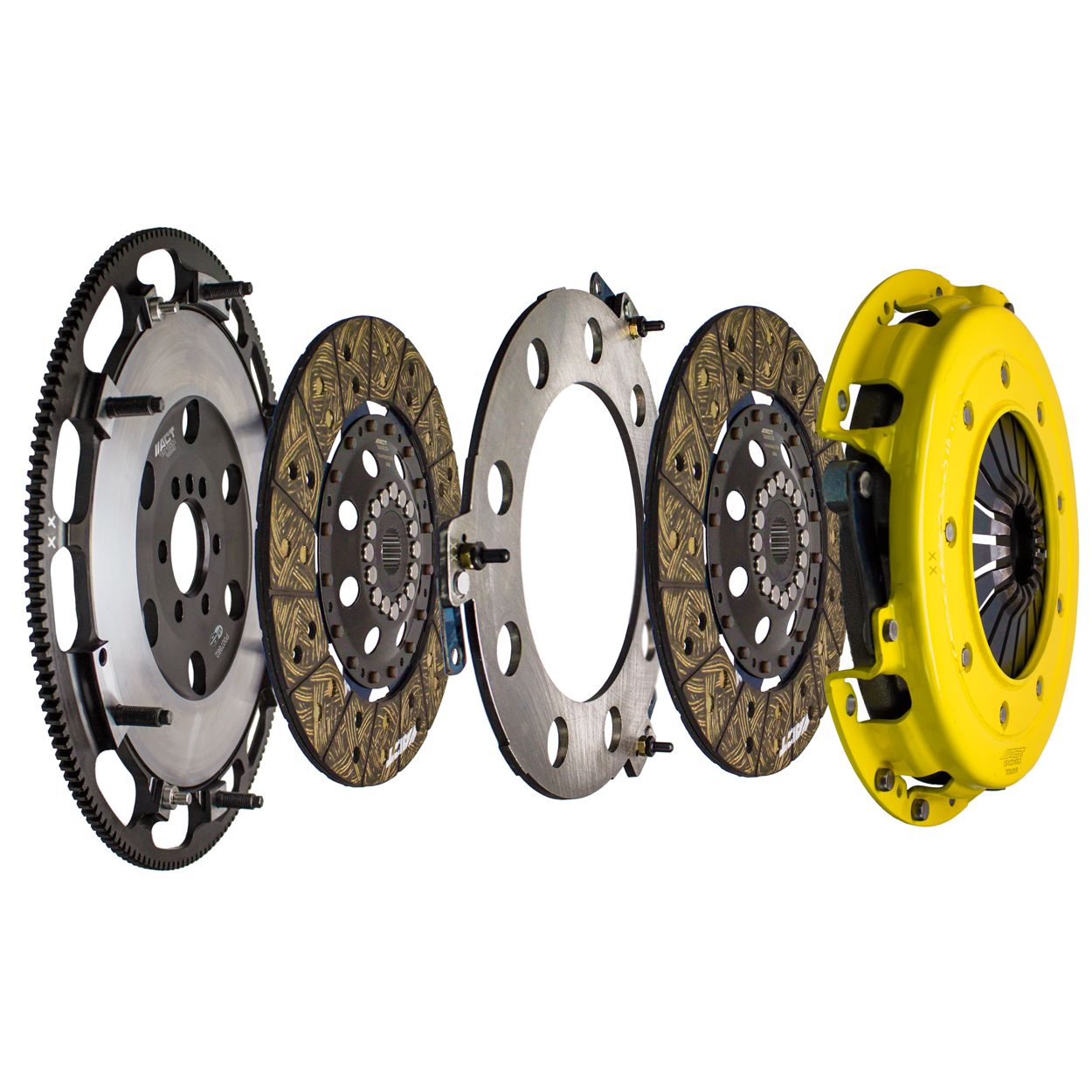 T3S-G01 street, twin disc kit offers twice the number of disc surfaces for better wear, heat capacity and long life compared to single disc kits. These kits use a proprietary Positive Lift Floater System design, which results in quiet operation with no floater rattle and no posts to wear. ACT twin disc kits endure an exclusive four-stage, heat-treating process on all diaphragms. The ACT twin disc features the ability to adjust for disc wear and provides equal disengagement for discs. The ACT Performance street rigid-hub discs feature premium organic materials with high copper content for better heat transfer and steel-backed lining for greater burst strength and durability. The chrome-moly hub is heat-treated for strength and durability. Rivet design and materials are carefully selected for maximum strength. All ACT twin disc kits include a CNC-machined and dynamically balanced flywheel to ensure trouble-free installation and operation. ACT twin disc kits include a pressure plate, two discs, a floater, flywheel and alignment tool. Some kits may included a pilot bearing and release bearing.