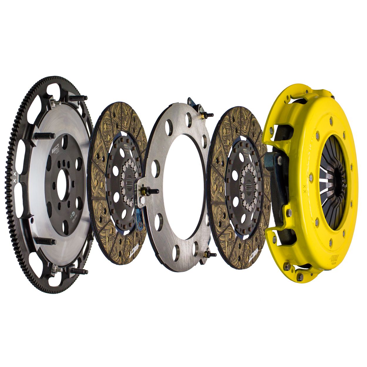 T3S-G02 street, twin disc kit offers twice the number of disc surfaces for better wear, heat capacity and long life compared to single disc kits. These kits use a proprietary Positive Lift Floater System design, which results in quiet operation with no floater rattle and no posts to wear. ACT twin disc kits endure an exclusive four-stage, heat-treating process on all diaphragms. The ACT twin disc features the ability to adjust for disc wear and provides equal disengagement for discs. The ACT Performance street rigid-hub discs feature premium organic materials with high copper content for better heat transfer and steel-backed lining for greater burst strength and durability. The chrome-moly hub is heat-treated for strength and durability. Rivet design and materials are carefully selected for maximum strength. All ACT twin disc kits include a CNC-machined and dynamically balanced flywheel to ensure trouble-free installation and operation. ACT twin disc kits include a pressure plate, two discs, a floater, flywheel and alignment tool. Some kits may included a pilot bearing and release bearing.