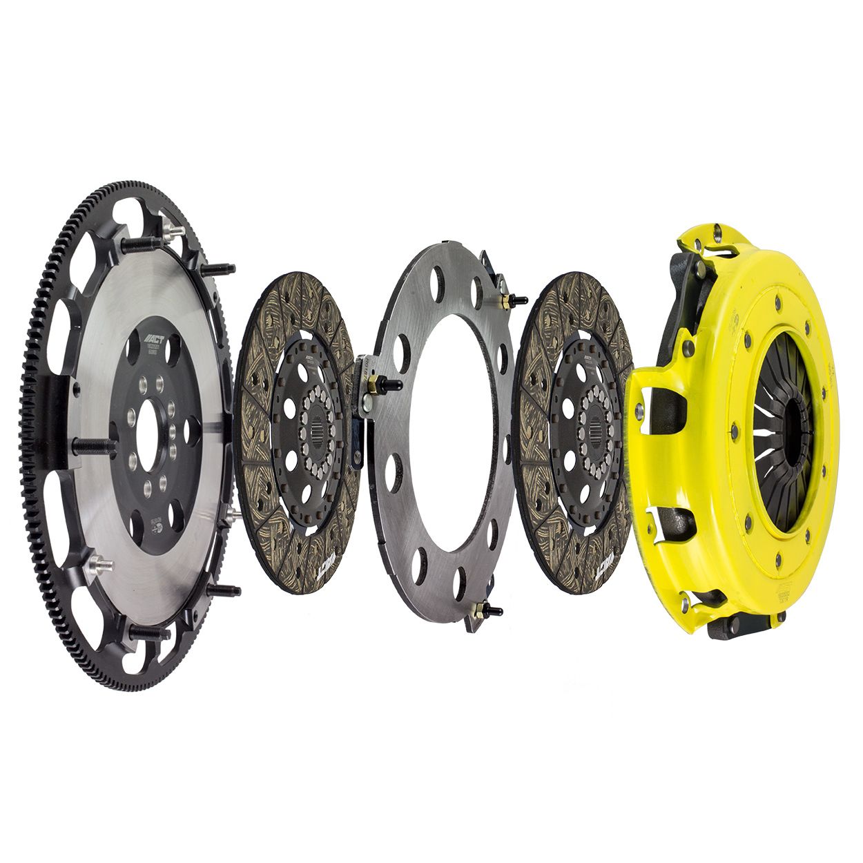 T3S-G06 street, twin disc kit offers twice the number of disc surfaces for better wear, heat capacity and long life compared to single disc kits. These kits use a proprietary Positive Lift Floater System design, which results in quiet operation with no floater rattle and no posts to wear. ACT twin disc kits endure an exclusive four-stage, heat-treating process on all diaphragms. The ACT twin disc features the ability to adjust for disc wear and provides equal disengagement for discs. The ACT Performance street rigid-hub discs feature premium organic materials with high copper content for better heat transfer and steel-backed lining for greater burst strength and durability. The chrome-moly hub is heat-treated for strength and durability. Rivet design and materials are carefully selected for maximum strength. All ACT twin disc kits include a CNC-machined and dynamically balanced flywheel to ensure trouble-free installation and operation. ACT twin disc kits include a pressure plate, two discs, a floater, flywheel and alignment tool. Some kits may included a pilot bearing and release bearing.