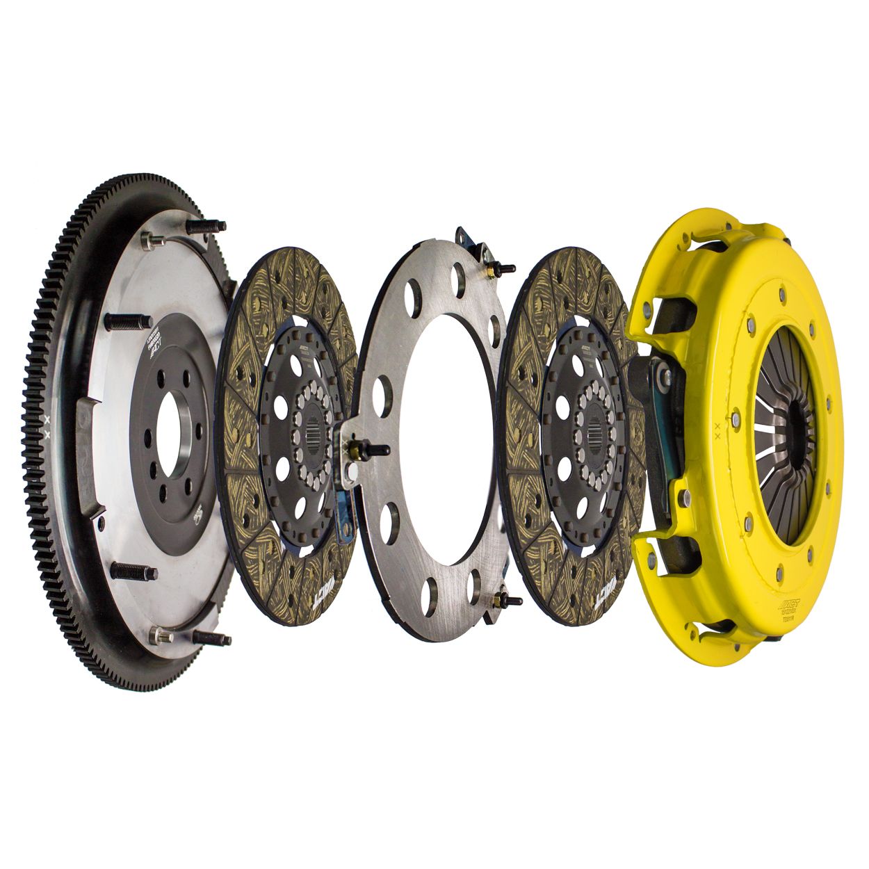 T3S-G10 street, twin disc kit offers twice the number of disc surfaces for better wear, heat capacity and long life compared to single disc kits. These kits use a proprietary Positive Lift Floater System design, which results in quiet operation with no floater rattle and no posts to wear. ACT twin disc kits endure an exclusive four-stage, heat-treating process on all diaphragms. The ACT twin disc features the ability to adjust for disc wear and provides equal disengagement for discs. The ACT Performance street rigid-hub discs feature premium organic materials with high copper content for better heat transfer and steel-backed lining for greater burst strength and durability. The chrome-moly hub is heat-treated for strength and durability. Rivet design and materials are carefully selected for maximum strength. All ACT twin disc kits include a CNC-machined and dynamically balanced flywheel to ensure trouble-free installation and operation. ACT twin disc kits include a pressure plate, two discs, a floater, flywheel and alignment tool. Some kits may included a pilot bearing and release bearing.