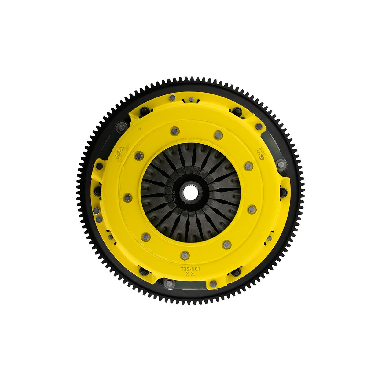 T3S-N01 street, twin disc kit offers twice the number of disc surfaces for better wear, heat capacity and long life compared to single disc kits. These kits use a proprietary Positive Lift Floater System design, which results in quiet operation with no floater rattle and no posts to wear. ACT twin disc kits endure an exclusive four-stage, heat-treating process on all diaphragms. The ACT twin disc features the ability to adjust for disc wear and provides equal disengagement for discs. The ACT Performance street rigid-hub discs feature premium organic materials with high copper content for better heat transfer and steel-backed lining for greater burst strength and durability. The chrome-moly hub is heat-treated for strength and durability. Rivet design and materials are carefully selected for maximum strength. All ACT twin disc kits include a CNC-machined and dynamically balanced flywheel to ensure trouble-free installation and operation. ACT twin disc kits include a pressure plate, two discs, a floater, flywheel and alignment tool. Some kits may included a pilot bearing and release bearing.