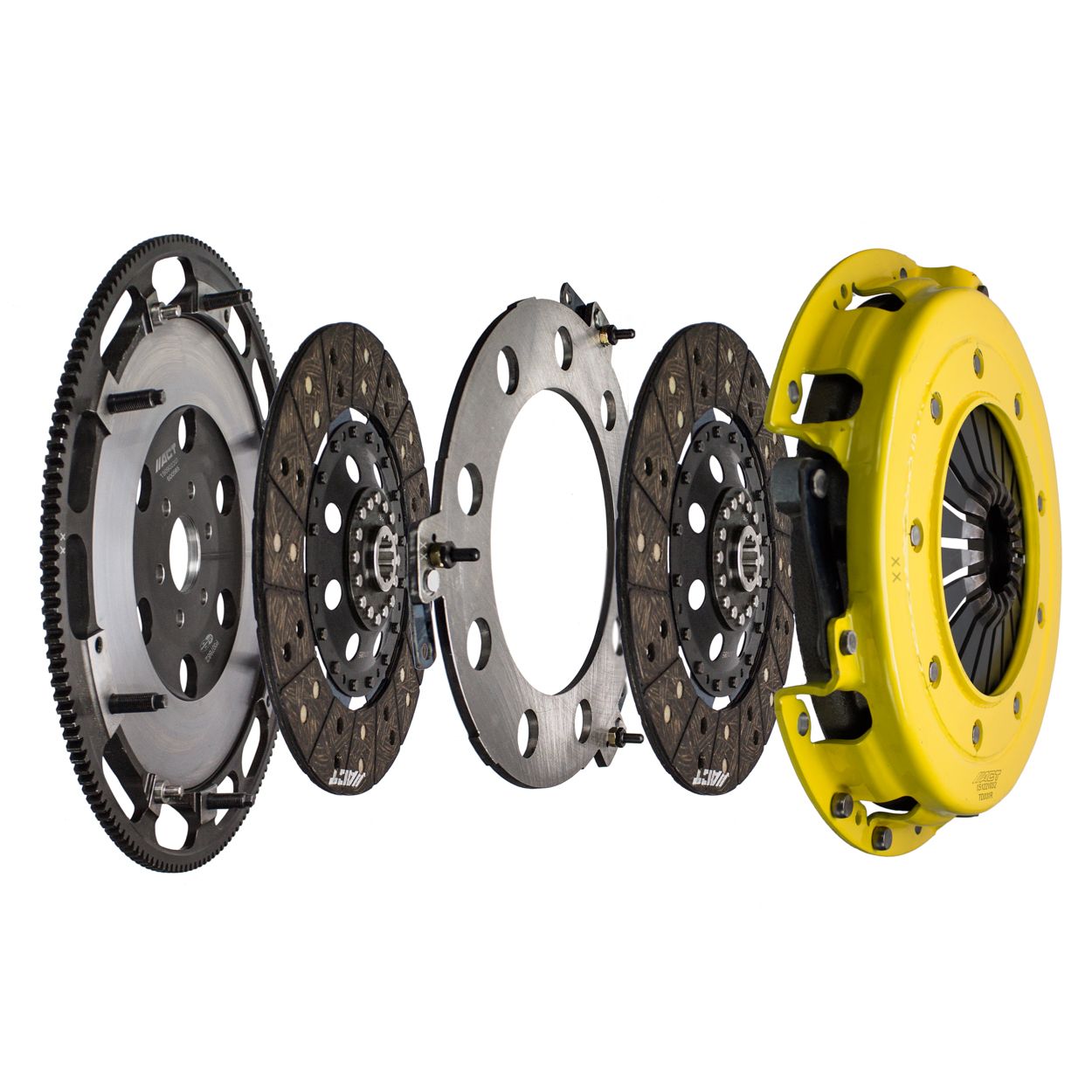 T3S-F02 street, twin disc kit offers twice the number of disc surfaces for better wear, heat capacity and long life compared to single disc kits. These kits use a proprietary Positive Lift Floater System design, which results in quiet operation with no floater rattle and no posts to wear. ACT twin disc kits endure an exclusive four-stage, heat-treating process on all diaphragms. The ACT twin disc features the ability to adjust for disc wear and provides equal disengagement for discs. The ACT Performance street rigid-hub discs feature premium organic materials with high copper content for better heat transfer and steel-backed lining for greater burst strength and durability. The chrome-moly hub is heat-treated for strength and durability. Rivet design and materials are carefully selected for maximum strength. All ACT twin disc kits include a CNC-machined and dynamically balanced flywheel to ensure trouble-free installation and operation. ACT twin disc kits include a pressure plate, two discs, a floater, flywheel and alignment tool. Some kits may included a pilot bearing and release bearing.