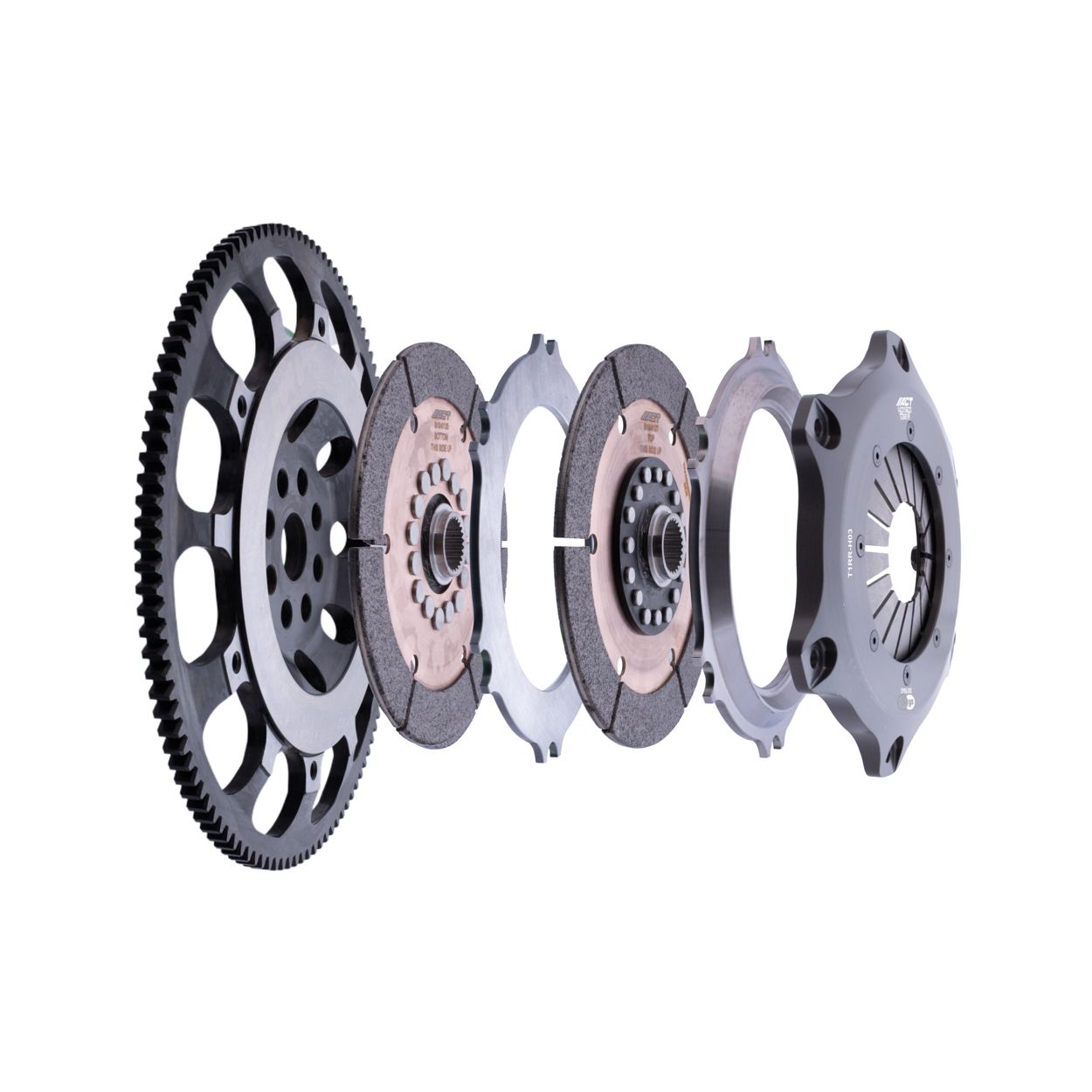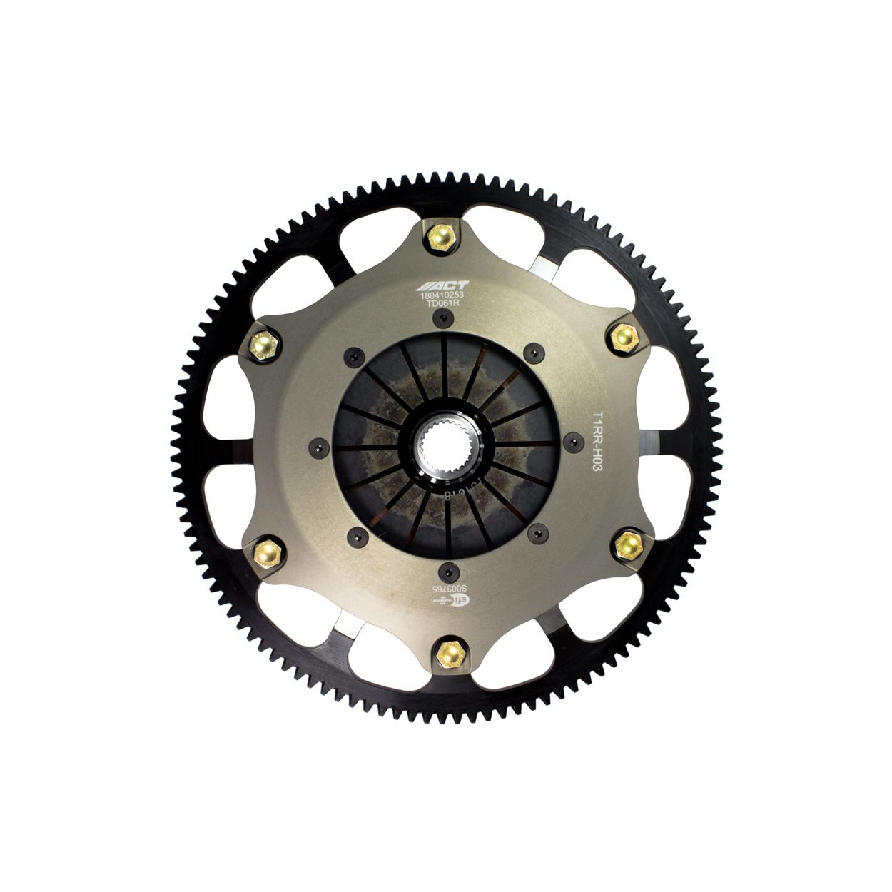 T1RR-H03 race, twin disc kits are race-ready for the serious enthusiast who needs a direct bolt-in kit, requiring no additional modifications. ACT's sintered iron race discs offer the highest torque capacity of all ACT race discs and have ultra-high heat capacity. Most kits offer pedal loads 10-20% higher than stock, yet increasing the clamp load by 80-90%. All ACT twin disc kits include a CNC-machined and dynamically balanced flywheel for trouble free use. All kits undergo an exclusive four-stage, heat-treating process on all diaphragms. ACT twin disc kits include a pressure plate, two discs, floater, flywheel and alignment tool. Some kits may include a pilot bearing and release bearing. ACT Twin disc kits meet SFI Specification 1.2.