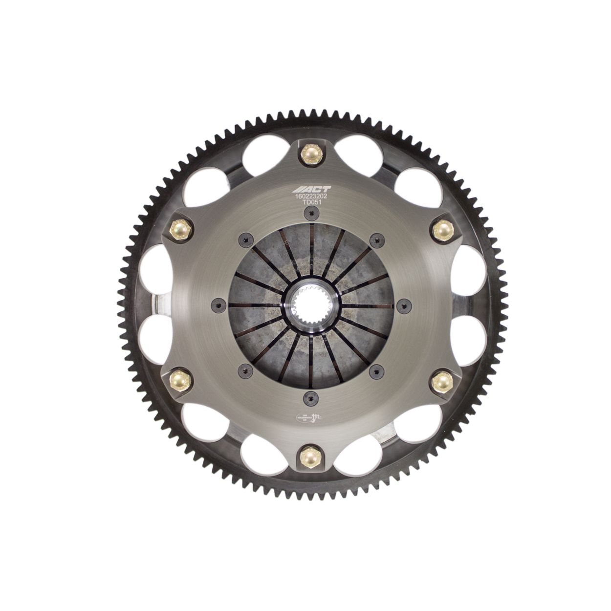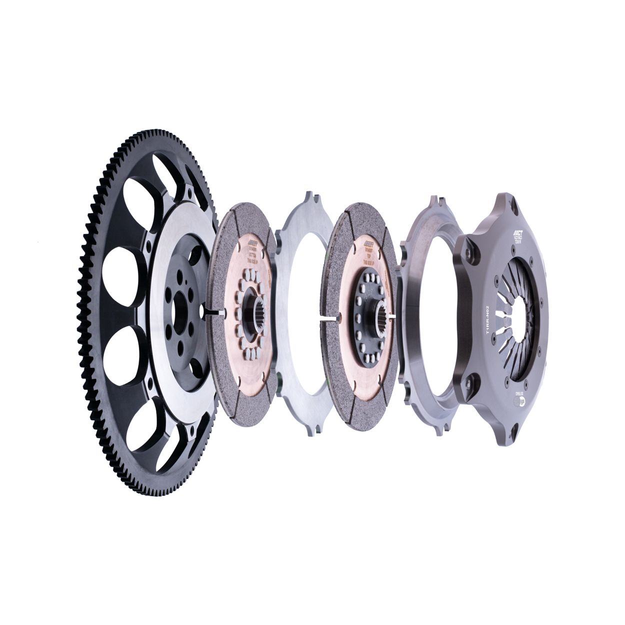 T1RR-N02 race, twin disc kits are race-ready for the serious enthusiast who needs a direct bolt-in kit, requiring no additional modifications. ACT's sintered iron race discs offer the highest torque capacity of all ACT race discs and have ultra-high heat capacity. Most kits offer pedal loads 10-20% higher than stock, yet increasing the clamp load by 80-90%. All ACT twin disc kits include a CNC-machined and dynamically balanced flywheel for trouble free use. All kits undergo an exclusive four-stage, heat-treating process on all diaphragms. ACT twin disc kits include a pressure plate, two discs, floater, flywheel and alignment tool. Some kits may include a pilot bearing and release bearing. ACT Twin disc kits meet SFI Specification 1.2.