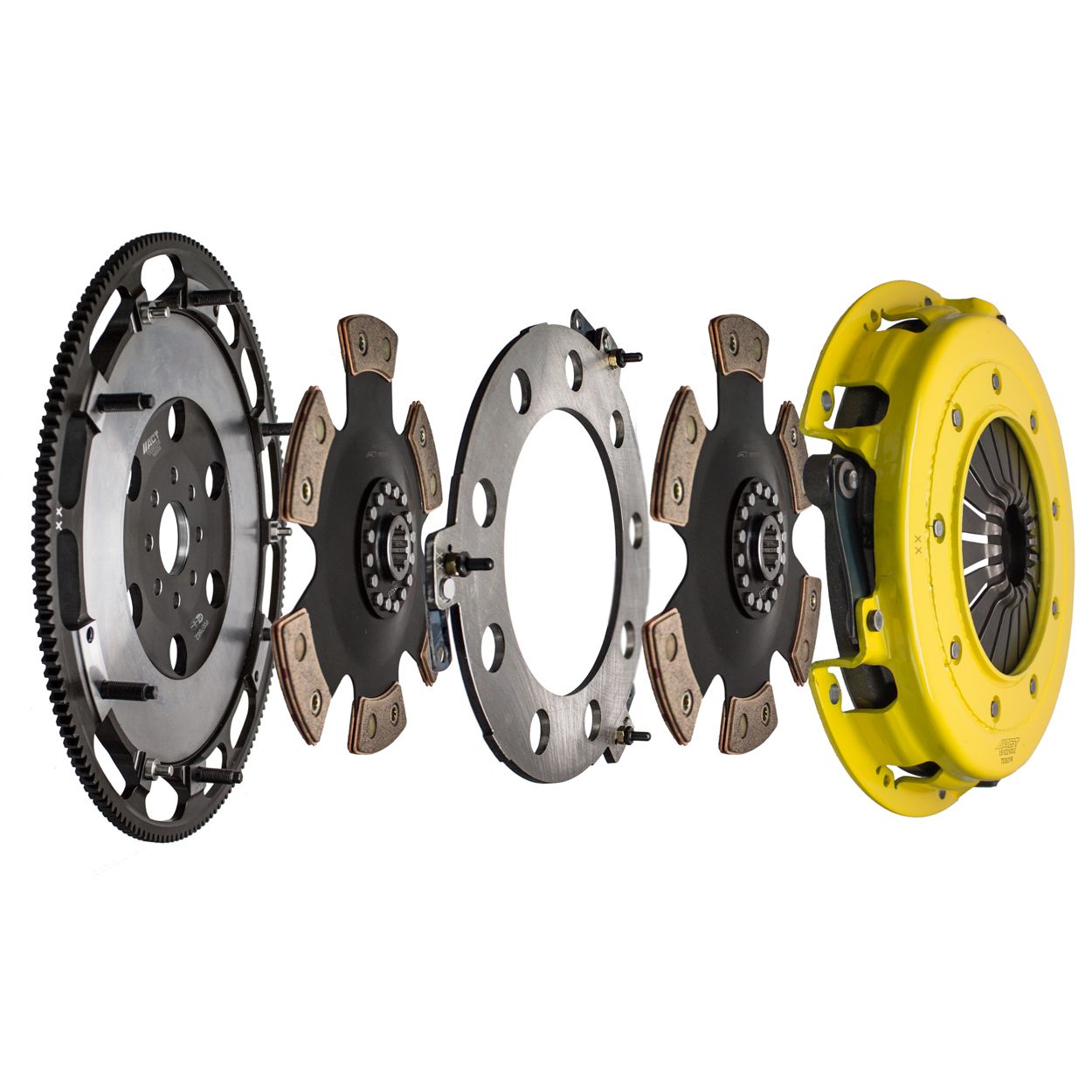 T2R-F01 race, twin disc kit offers twice the number of disc surfaces for better wear, heat capacity and long life compared to single disc kits. These kits use a proprietary Positive Lift Floater System design, which results in quiet operation with no floater rattle and no posts to wear. ACT twin disc kits undergo an exclusive four-stage, heat-treating process on all diaphragms. The ACT twin disc features the ability to adjust for disc wear and provides equal disengagement for discs. ACT's 6-pad rigid race discs are made with high quality, ceramic friction materials. The chrome-moly hub is heat-treated for strength and durability. The lightweight, rigid design allows for quicker shifts and trouble-free service. All ACT twin disc kits include a CNC-machined and dynamically balanced flywheel to ensure trouble-free installation and operation. ACT twin disc kits include a pressure plate, two discs, a floater, flywheel and alignment tool. Some kits may include a pilot bearing and release bearing.