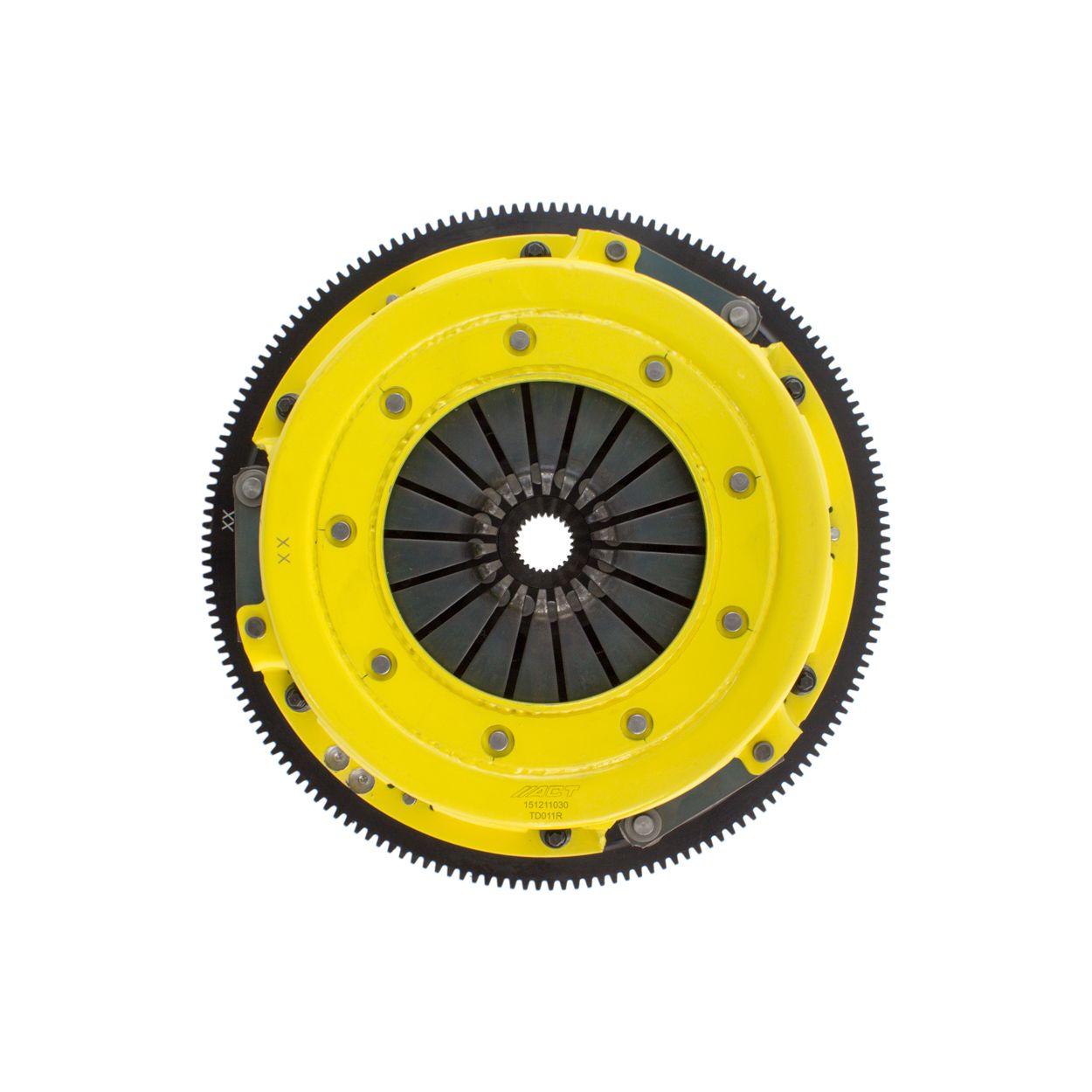 T2S-G06 street twin disc kit offers twice the number of disc surfaces for better wear, heat capacity and long life compared to single disc kits. These kits use a proprietary Positive Lift Floater System design, which results in quiet operation with no floater rattle and no posts to wear. ACT twin disc kits undergo an exclusive four-stage, heat treating process on all diaphragms. The ACT twin disc features the ability to adjust for disc wear and provides equal disengagement for discs. The ACT Performance street rigid-hub discs feature premium organic materials with high copper content for better heat transfer and steel-backed lining for greater burst strength and durability. The chrome-moly hub is heat-treated for strength and durability. Rivet design and materials are carefully selected for maximum strength. All ACT twin disc kits include a CNC-machined and dynamically balanced flywheel to ensure trouble-free installation and operation. ACT twin disc kits include a pressure plate, two discs, a floater, flywheel and alignment tool. Some kits may include a pilot bearing and release bearing.