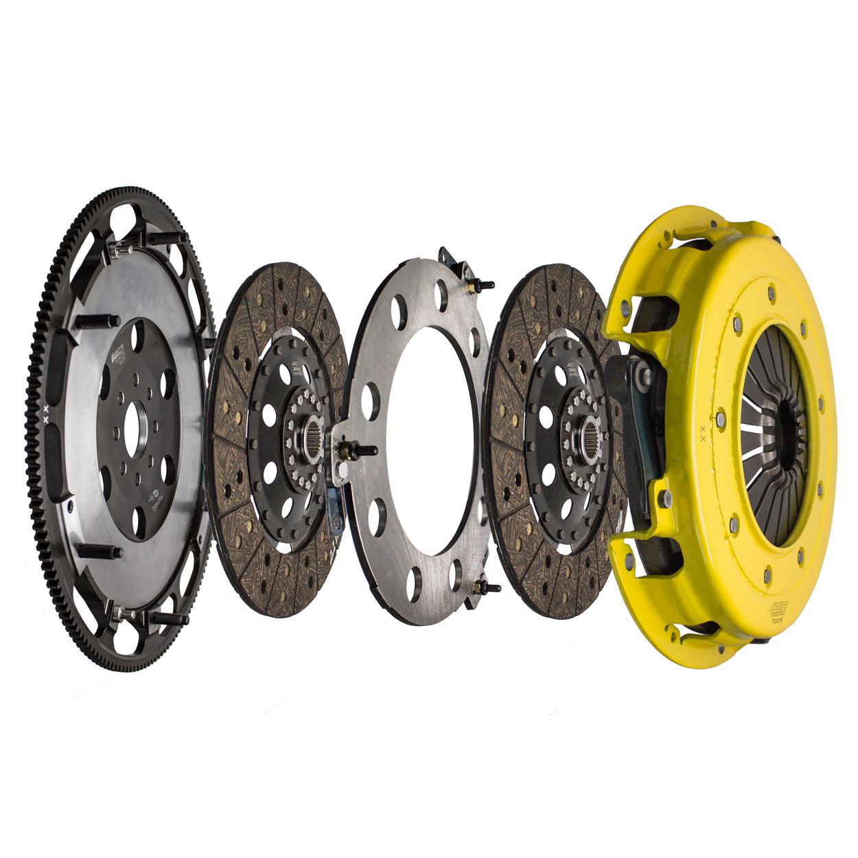 T2S-F03 street twin disc kit offers twice the number of disc surfaces for better wear, heat capacity and long life compared to single disc kits. These kits use a proprietary Positive Lift Floater System design, which results in quiet operation with no floater rattle and no posts to wear. ACT twin disc kits undergo an exclusive four-stage, heat treating process on all diaphragms. The ACT twin disc features the ability to adjust for disc wear and provides equal disengagement for discs. The ACT Performance street rigid-hub discs feature premium organic materials with high copper content for better heat transfer and steel-backed lining for greater burst strength and durability. The chrome-moly hub is heat-treated for strength and durability. Rivet design and materials are carefully selected for maximum strength. All ACT twin disc kits include a CNC-machined and dynamically balanced flywheel to ensure trouble-free installation and operation. ACT twin disc kits include a pressure plate, two discs, a floater, flywheel and alignment tool. Some kits may include a pilot bearing and release bearing.
