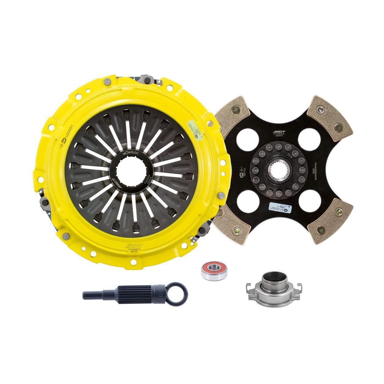 SB10-XTR4 kit features an Xtreme pressure plate for the most demanding driver. ACT Xtreme pressure plates use exclusive diaphragm design to increase clamp load, reduce deflection and maximize clutch life. All diaphragms endure a four-stage, heat-treating process for unparalleled performance. ACT pressure plates have precision cover stampings to provide rigidity and consistency. ACT's 4-pad rigid race discs are made with high quality, ceramic friction materials. The chrome-moly hub is heat-treated for strength and durability. The lightweight, rigid design allows for quicker shifts and smooth, trouble-free service. With the 4-pad rigid race disc, engagement is harsher, but shifting is faster. The 4-pad rigid race disc is well-suited for the smaller disc sizes in smaller engines. Monoloc is a one-piece, direct replacement or upgrade to the standard, two-piece wedge collar and wire ring featured in pull-type clutches. The spring tension of the segmented retaining ring is carefully calculated and tested for optimal performance. It provides uniform loading on the bearing and pressure plate to assure proper alignment, regardless of driver influence or vehicle modifications. Monoloc's hardened chrome-moly steel construction will provide years of service.