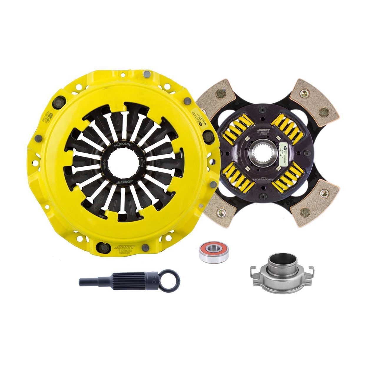 SB9-XTG4 kit features an Xtreme pressure plate for the most demanding driver. ACT Xtreme pressure plates use exclusive diaphragm design to increase clamp load, reduce deflection and maximize clutch life. All diaphragms endure a four-stage, heat-treating process for unparalleled performance. ACT pressure plates have precision cover stampings to provide rigidity and consistency. ACT's 4-pad spring-centered race disc features a spring-center construction to properly damp torsional vibrations for quieter operation and resist failure even under harsh conditions. ACT spring retainers utilize wraparound spring windows and thicker retainer stampings to provide spring support, reduce stress concentrations, and increase strength and reliability. With the 4-pad spring-centered race disc, engagement is harsher, but shifting is faster. ACT's 4-pad spring-centered race disc is well-suited for smaller disc sizes in smaller engines. Monoloc is a one-piece, direct replacement or upgrade to the standard, two-piece wedge collar and wire ring featured in pull-type clutches. The spring tension of the segmented retaining ring is carefully calculated and tested for optimal performance. It provides uniform loading on the bearing and pressure plate to assure proper alignment, regardless of driver influence or vehicle modifications. Monoloc's hardened chrome-moly steel construction will provide years of service.