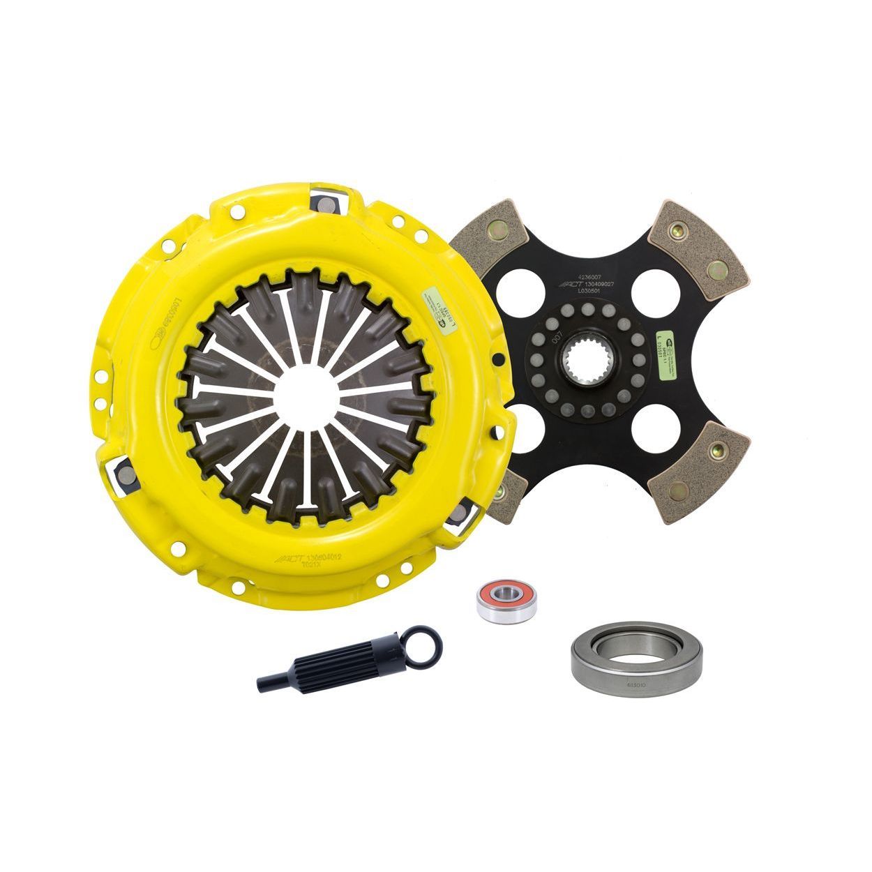 TS1-XTR4 kit features an Xtreme pressure plate for the most demanding driver. ACT Xtreme pressure plates use exclusive diaphragm design to increase clamp load, reduce deflection and maximize clutch life. All diaphragms endure a four-stage, heat-treating process for unparalleled performance. ACT pressure plates have precision cover stampings to provide rigidity and consistency. ACT's 4-pad rigid race discs are made with high quality, ceramic friction materials. The chrome-moly hub is heat-treated for strength and durability. The lightweight, rigid design allows for quicker shifts and smooth, trouble-free service. With the 4-pad rigid race disc, engagement is harsher, but shifting is faster. The 4-pad rigid race disc is well-suited for the smaller disc sizes in smaller engines.