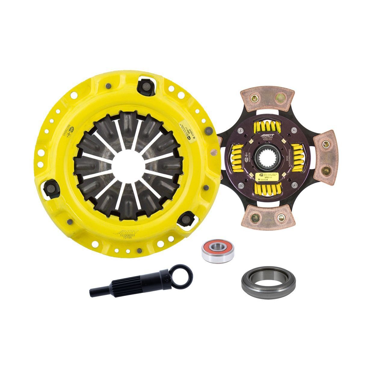 TK2-XTG4 kit features an Xtreme pressure plate for the most demanding driver. ACT Xtreme pressure plates use exclusive diaphragm design to increase clamp load, reduce deflection and maximize clutch life. All diaphragms endure a four-stage, heat-treating process for unparalleled performance. ACT pressure plates have precision cover stampings to provide rigidity and consistency. ACT's 4-pad spring-centered race disc features a spring-center construction to properly damp torsional vibrations for quieter operation and resist failure even under harsh conditions. ACT spring retainers utilize wraparound spring windows and thicker retainer stampings to provide spring support, reduce stress concentrations, and increase strength and reliability. With the 4-pad spring-centered race disc, engagement is harsher, but shifting is faster. ACT's 4-pad spring-centered race disc is well-suited for smaller disc sizes in smaller engines.