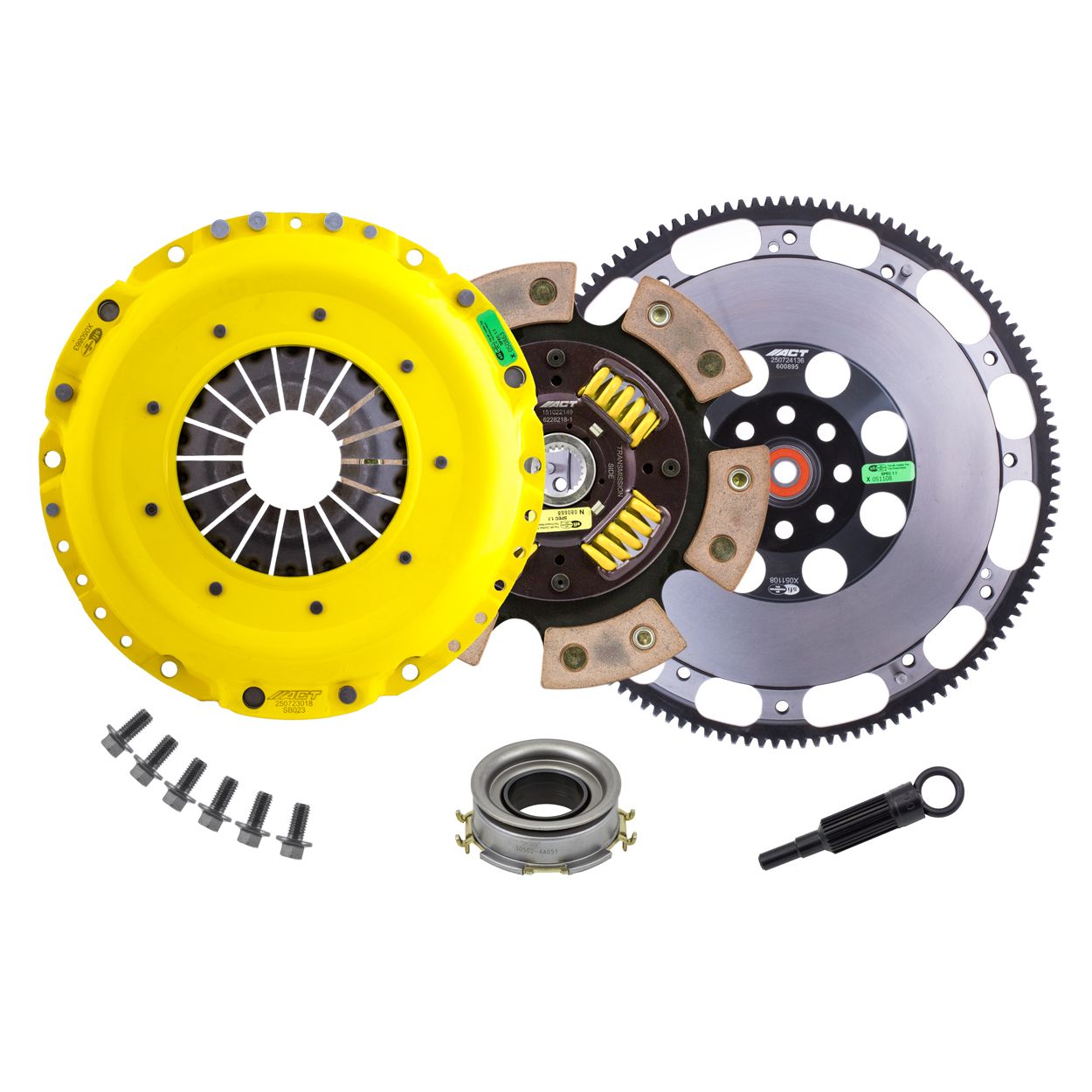 SB8-XTG6 kit features an Xtreme pressure plate for the most demanding driver. ACT Xtreme pressure plates use exclusive diaphragm design to increase clamp load, reduce deflection and maximize clutch life. All diaphragms endure a four-stage, heat-treating process for unparalleled performance. ACT pressure plates have precision cover stampings to provide rigidity and consistency. ACT's 6-pad spring-centered race disc features a spring-center construction to properly damp torsional vibrations and resist failure under harsh conditions. ACT spring retainers utilize wraparound spring windows and thicker retainer stampings to provide spring support, reduce stress concentrations, and increase strength and reliability. With the 6-pad spring-centered race disc, engagement is harsher, but shifting is faster. The 6-pad spring-centered disc is recommended for larger clutch sizes to absorb more heat.