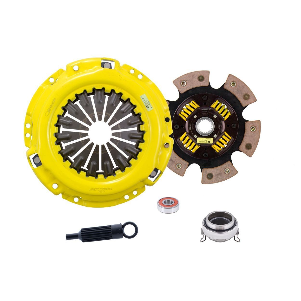 TS3-XTG6 kit features an Xtreme pressure plate for the most demanding driver. ACT Xtreme pressure plates use exclusive diaphragm design to increase clamp load, reduce deflection and maximize clutch life. All diaphragms endure a four-stage, heat-treating process for unparalleled performance. ACT pressure plates have precision cover stampings to provide rigidity and consistency. ACT's 6-pad spring-centered race disc features a spring-center construction to properly damp torsional vibrations and resist failure under harsh conditions. ACT spring retainers utilize wraparound spring windows and thicker retainer stampings to provide spring support, reduce stress concentrations, and increase strength and reliability. With the 6-pad spring-centered race disc, engagement is harsher, but shifting is faster. The 6-pad spring-centered disc is recommended for larger clutch sizes to absorb more heat.