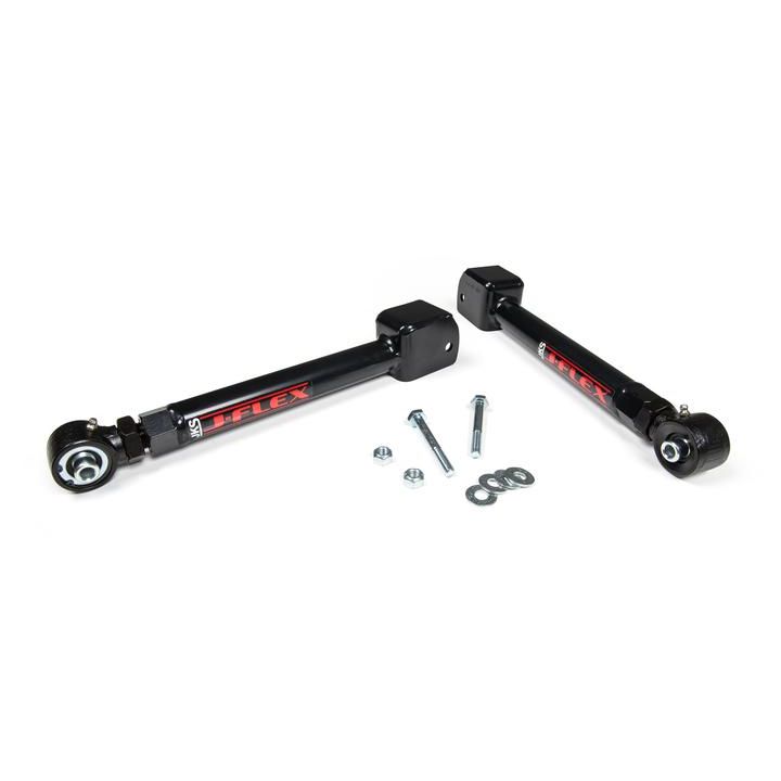 Enhance your Wrangler TJ, LJ, or Cherokee XJ Jeep with JKS J-Flex adjustable front upper Control Arms. CNC-bent from DOM tubing for proper tire, frame and axle mount clearance, these front upper control arms feature forged flex ends that are adjustable. The design increases reliability and allows you to fine tune arm length. The ends are also fully rebuildable and greaseable. With heavy duty 1/4"-12 threads and hex shaped weld-in threaded bung, tightening of the included jam nuts is super easy and secure. At the non-adjustable end, the bolt-on mount is “boxed” for increased strength. Arms are powder-coated for a long-lasting finish. Sold in pairs.