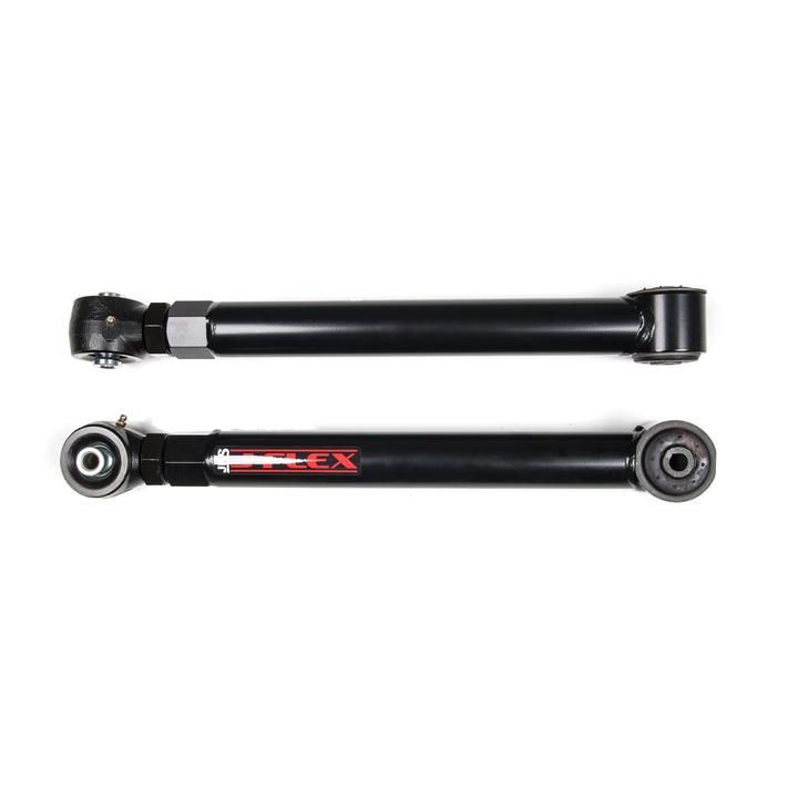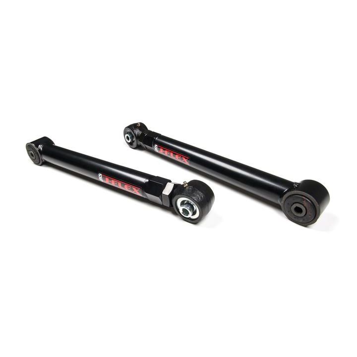 Upgrade your Jeep Wrangler JK’s performance and reliability with JKS J-Flex adjustable rear lower control arms. CNC-bent from stout DOM tubing, the fully adjustable design allows you to fine-tune suspension geometry. The fully adjustable design allows you to fine-tune arm length. The ends are also fully rebuildable and greaseable. With heavy duty 1-1/4"-12 threads and hex shaped weld-in bungs, tightening of the included jam nuts is super easy and secure. At the non-adjustable end, factory style rubber bushings provide quiet, maintenance-free operation. Arms are powder-coated for a long-lasting finish. Sold in pairs.