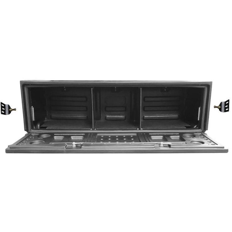 Package Contents: 58x19x17 cargo box, premium installation hardware,including sided panel mounts, interior divider panels, exterior tie down rings, install instructions