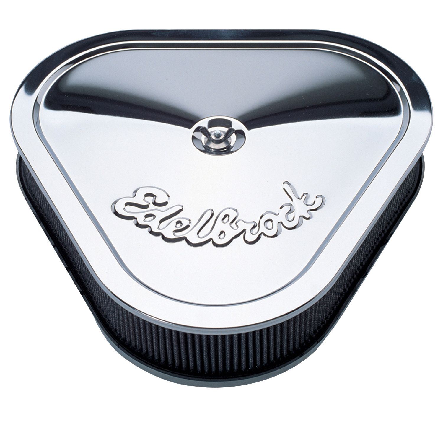 The Signature Series triangular air cleaner #1222 is a new style with a shape reminiscent of the muscle car era. This hot looking chrome air cleaner has the classic Edelbrock signature. This triangular air cleaner comes with high-quality 2-1/2" washable, pre-oiled cotton gauze filter for excellent filtration. Designed for use with 5-1/8" diameter carbs (Edelbrock square-bore, Q-Jet, etc.), the Pro-Flo #1222 clears HEI distributors and electric choke housings. Air cleaner dimensions: 14-1/8" wide x 13-3/8" long