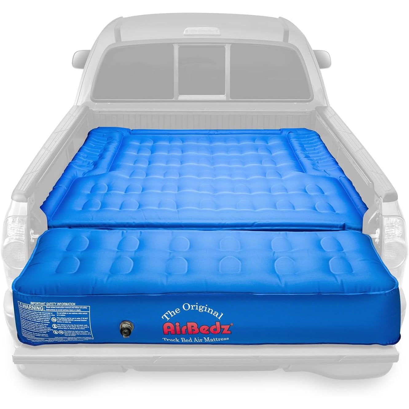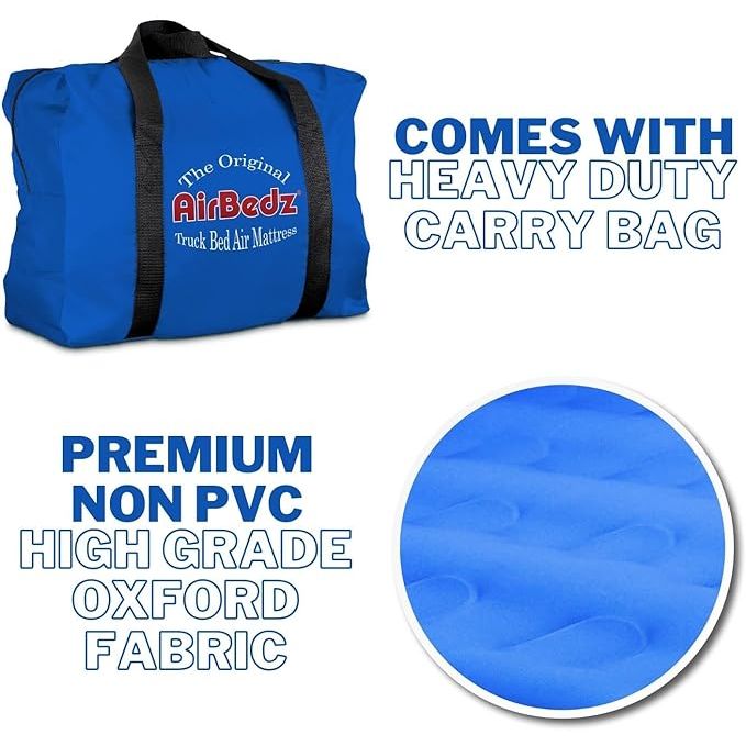 Airbedz by Pittman Outdoors Original Truck Bed Air Mattresses are available in multiple sizes and colors to fit mid and full-size trucks in long and short bed layouts. Cutouts on each side allow the mattress to fit around and over the wheel wells, creating a sleeping area that utilizes the entire truck bed, providing more room and comfort for outdoor enthusiasts. A built-in rechargeable pump inflates and deflates the mattress with the flip of a switch. An integrated air coil system evenly distributes weight over a 12-inch-thick mattress. Heavy-duty cloth construction ensures a more puncture resistant mattress that meets the needs of extreme outdoor enthusiasts. Where playing hard and sleeping well are all that matter. Optional inflatable Wheel Well Inserts transform AirBedz into a standard air mattress suitable for home and tent use. (Inserts sold separately)Compatible with: Chevy Silverado 5.8’ bed, Dodge Ram 5.6’ bed, Ford F150 5.5’ bed, GMC Sierra 5.8’ bed, Nissan Titan 5.5’ bed, and Toyota Tundra 5.5 bed.