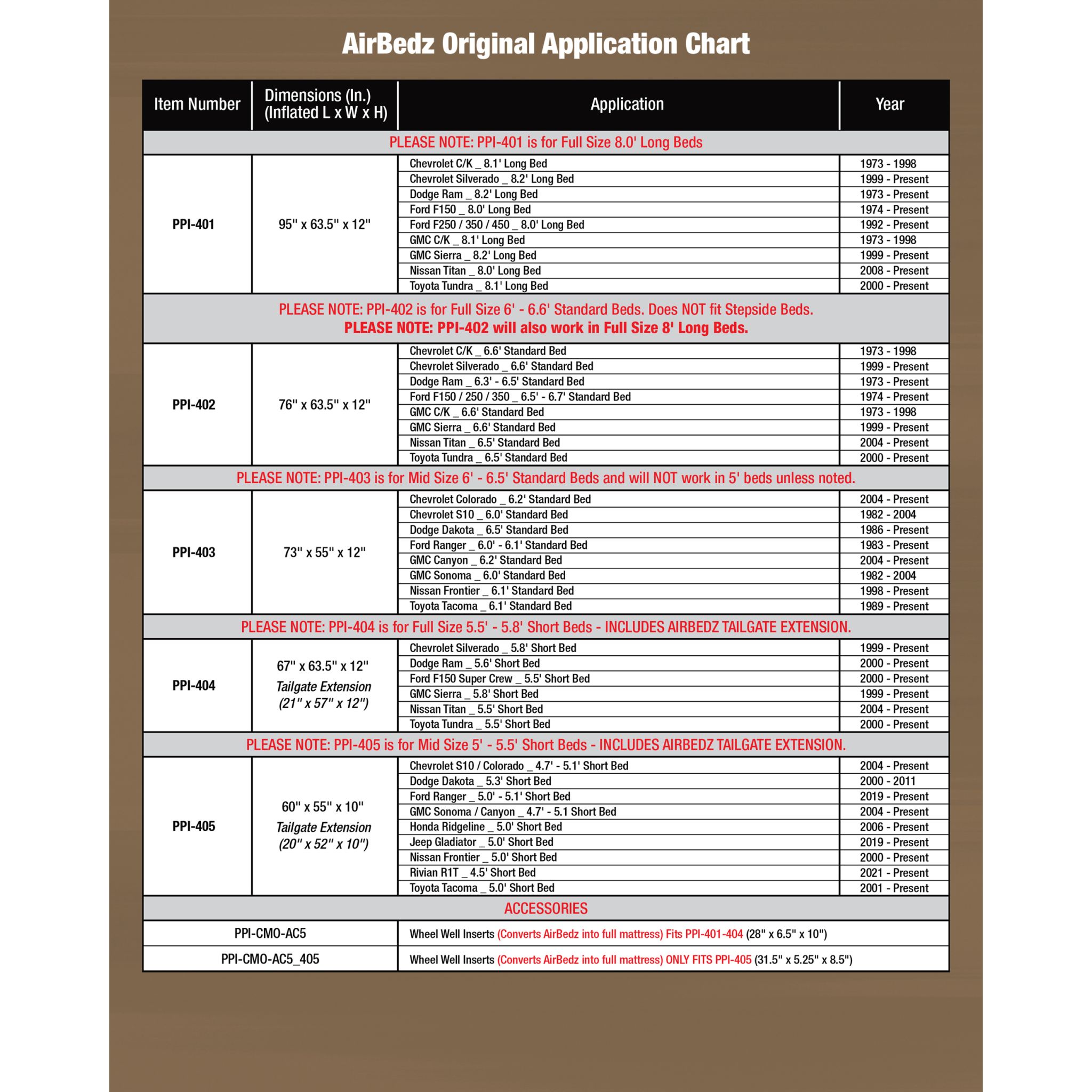 Airbedz by Pittman Outdoors Original Truck Bed Air Mattresses are available in multiple sizes and colors to fit mid and full-size trucks in long and short bed layouts. Cutouts on each side allow the mattress to fit around and over the wheel wells, creating a sleeping area that utilizes the entire truck bed, providing more room and comfort for outdoor enthusiasts. A built-in rechargeable pump inflates and deflates the mattress with the flip of a switch. An integrated air coil system evenly distributes weight over a 12-inch-thick mattress. Heavy-duty cloth construction ensures a more puncture resistant mattress that meets the needs of extreme outdoor enthusiasts. Where playing hard and sleeping well are all that matter. Optional inflatable Wheel Well Inserts transform AirBedz into a standard air mattress suitable for home and tent use. (Inserts sold separately) Compatible with: Chevy Silverado 5.8’ bed, Dodge Ram 5.6’ bed, Ford F150 5.5’ bed, GMC Sierra 5.8’ bed, Nissan Titan 5.5’ bed, and Toyota Tundra 5.5 bed.
