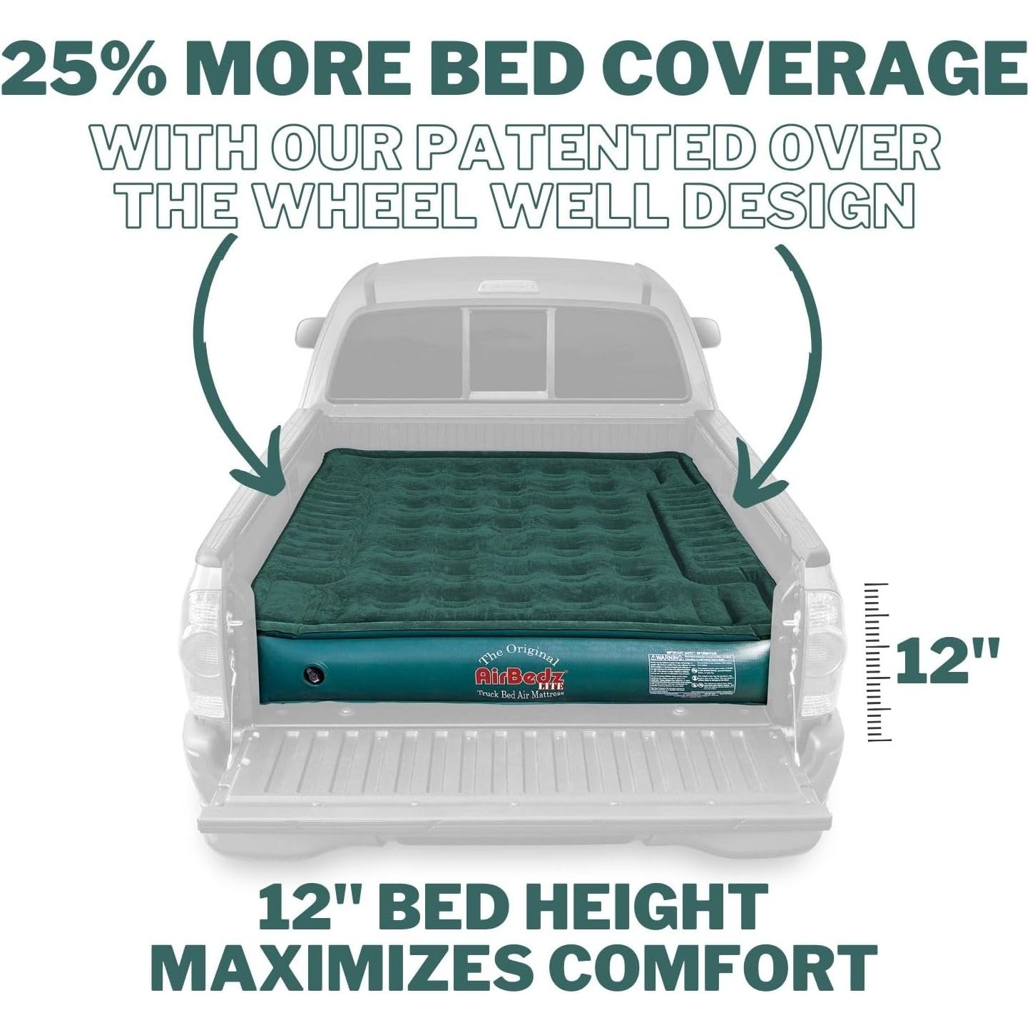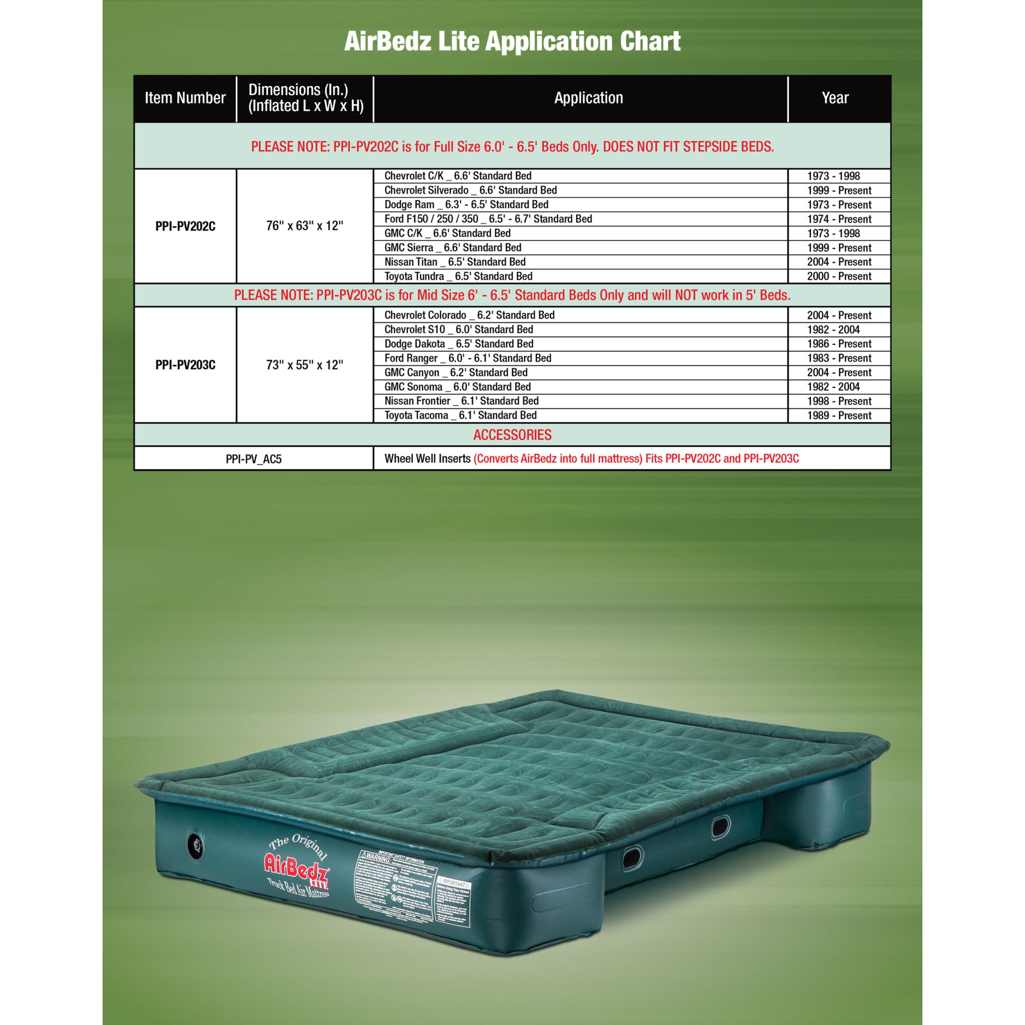 Airbedz LITE by Pittman Outdoors Original Truck Bed Air Mattresses are available in multiple sizes to fit mid and full-size trucks in long and short bed layouts. Cutouts on each side allow the mattress to fit around and over the wheel wells, creating a sleeping area that utilizes the entire truck bed, providing more room and comfort for outdoor enthusiasts. A portable DC air pump with a 16 ft. cord inflates and deflates the mattress with the flip of a switch. An integrated air coil system evenly distributes weight over a 12-inch-thick mattress. Heavy-duty PVC construction ensures a more puncture resistant mattress that meets the needs of extreme outdoor enthusiasts. Where playing hard and sleeping well are all that matter. Optional inflatable Wheel Well Inserts transform AirBedz into a standard air mattress suitable for home and tent use. (Inserts sold separately) Compatible with: Chevy Colorado 6.2’ bed, Chevy S10 6.0 bed, Dodge Dakota 6.5’ bed, Ford Ranger 6.0’-6.1’ bed, GMC Canyon 6.2’ bed, GMC Sonoma 6.0’ bed, Nissan Frontier 6.1’ bed, Toyota Tacoma 6.1’ bed
