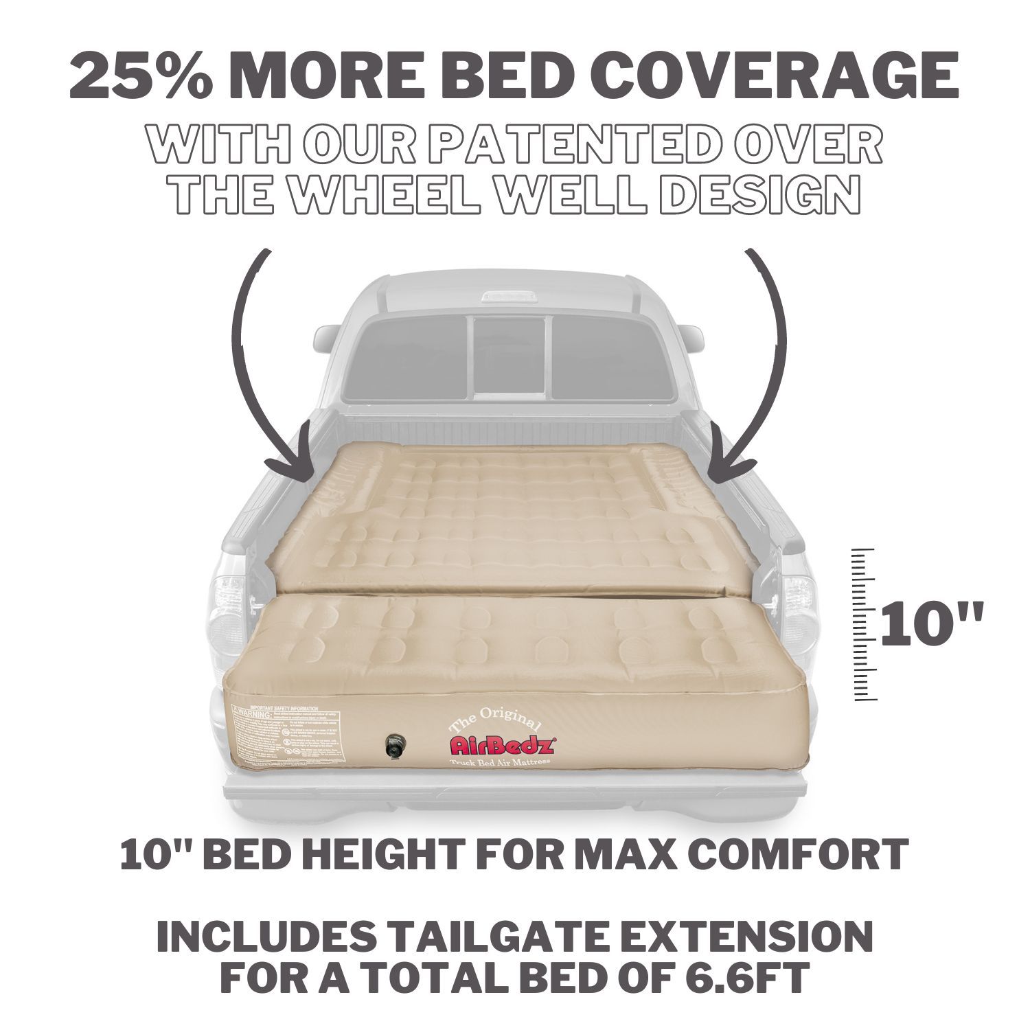 Airbedz by Pittman Outdoors Original Truck Bed Air Mattresses are available in multiple sizes and colors to fit mid and full-size trucks in long and short bed layouts. Cutouts on each side allow the mattress to fit around and over the wheel wells, creating a sleeping area that utilizes the entire truck bed, providing more room and comfort for outdoor enthusiasts. A built-in rechargeable pump inflates and deflates the mattress with the flip of a switch. An integrated air coil system evenly distributes weight over a 12-inch-thick mattress. Heavy-duty cloth construction ensures a more puncture resistant mattress that meets the needs of extreme outdoor enthusiasts. Where playing hard and sleeping well are all that matter. Optional inflatable Wheel Well Inserts transform AirBedz into a standard air mattress suitable for home and tent use. (inserts sold separately) Compatible with: Chevy S10/Colorado 4.7’-5.1’ bed, Dodge Dakota 5.3’ bed, Ford Ranger 5.0’- 5.1’ bed, GMC Sonoma/Canyon 4.7’-5.1’ bed, Honda Ridgeline 5.0’ bed, Jeep Gladiator 5.0’ bed, Nissan Frontier 5.0’ bed, Rivian R1T 4.5’ bed, and Toyota Tacoma 5.0’ bed.