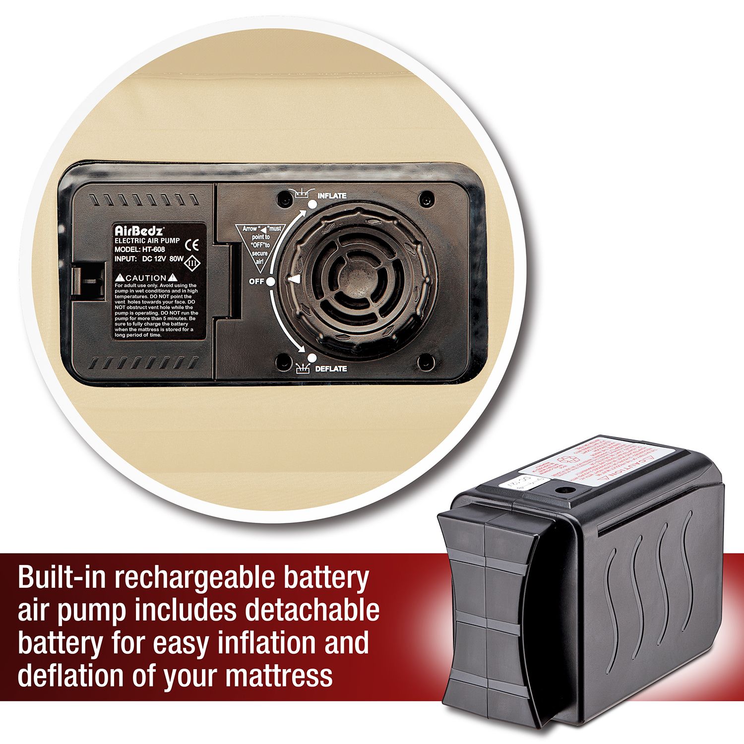 AirBedz XUV Air Mattresses with built in rechargeable battery air pump are designed to fit your JEEP, SUV & Crossover vehicle, creating a sleep area that utilizes the entire cargo area with back seats down providing more room and comfort for the outdoor Over lander enthusiasts. Heavy-duty cloth construction ensures a more puncture resistant mattress meeting the extreme outdoorsmen's needs and ensuring a good night's sleep wherever you go. This high-quality SUV air mattress allows you to sleep comfortably in your car during camping and traveling. The Built-in, pump has a portable rechargeable battery for easy inflating and deflating. The portable rechargeable battery initial use should be charged for 10 hours using AC charger (Home Charger). To take it for an outdoor event simply import the portable rechargeable battery in the built-in pump and turn the knob for maximum convenience.