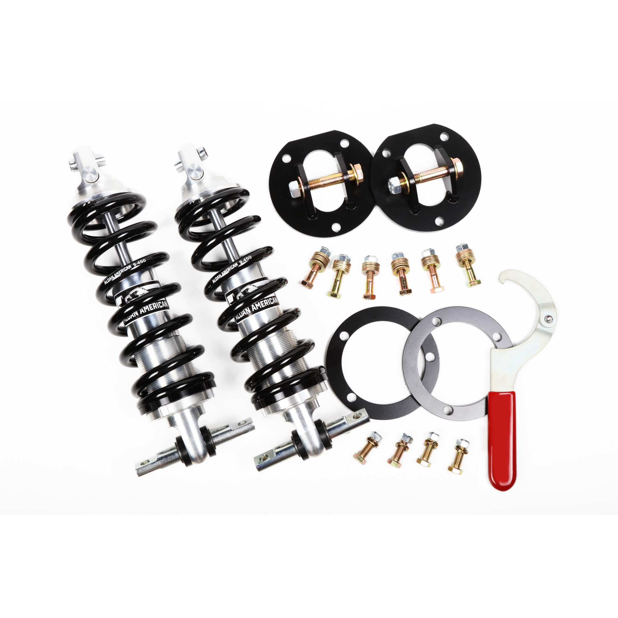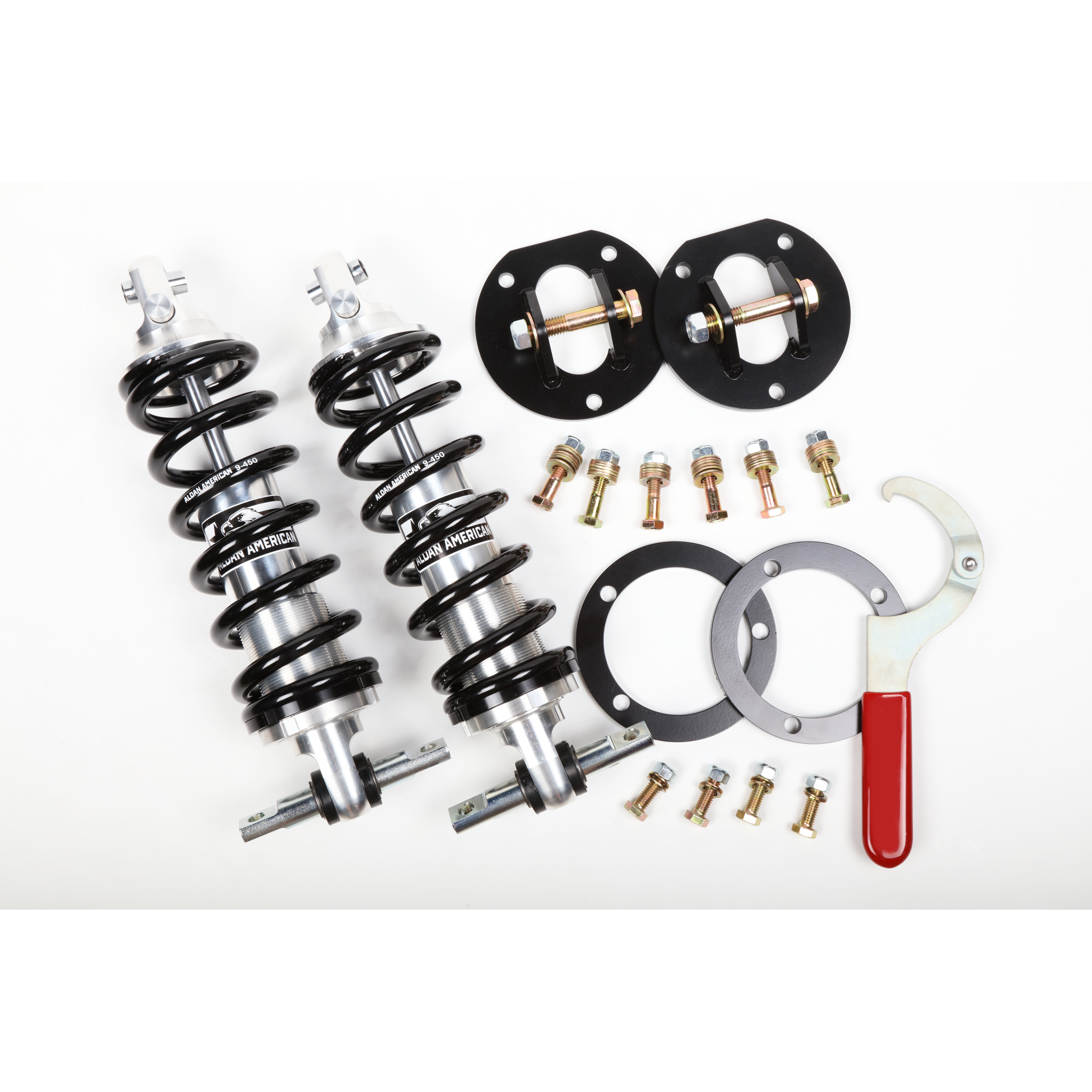 Coil-Over Kit, Ford Mustang. 64-73. Front, Pair. Double Adj. BB. Big Block, Full Kit, Bolt-On. Converts stock suspension to coil-overs. Includes 2 Striker Series coil-overs, 550 lb coil-springs, hardware, TIG welded bracketry. Made in USA