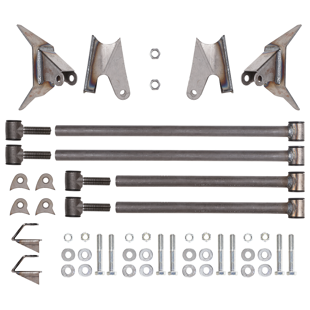 Universal 4-Link Kit, Triangulated. Does not require panhard bar. Includes: poly bushings, .156 Wall DOM tubing. Hardware, rod ends, laser-cut & TIG welded brackets. 23 in. upper bars, 17 in. lower bars. Use with 3 in. axle. Made in USA