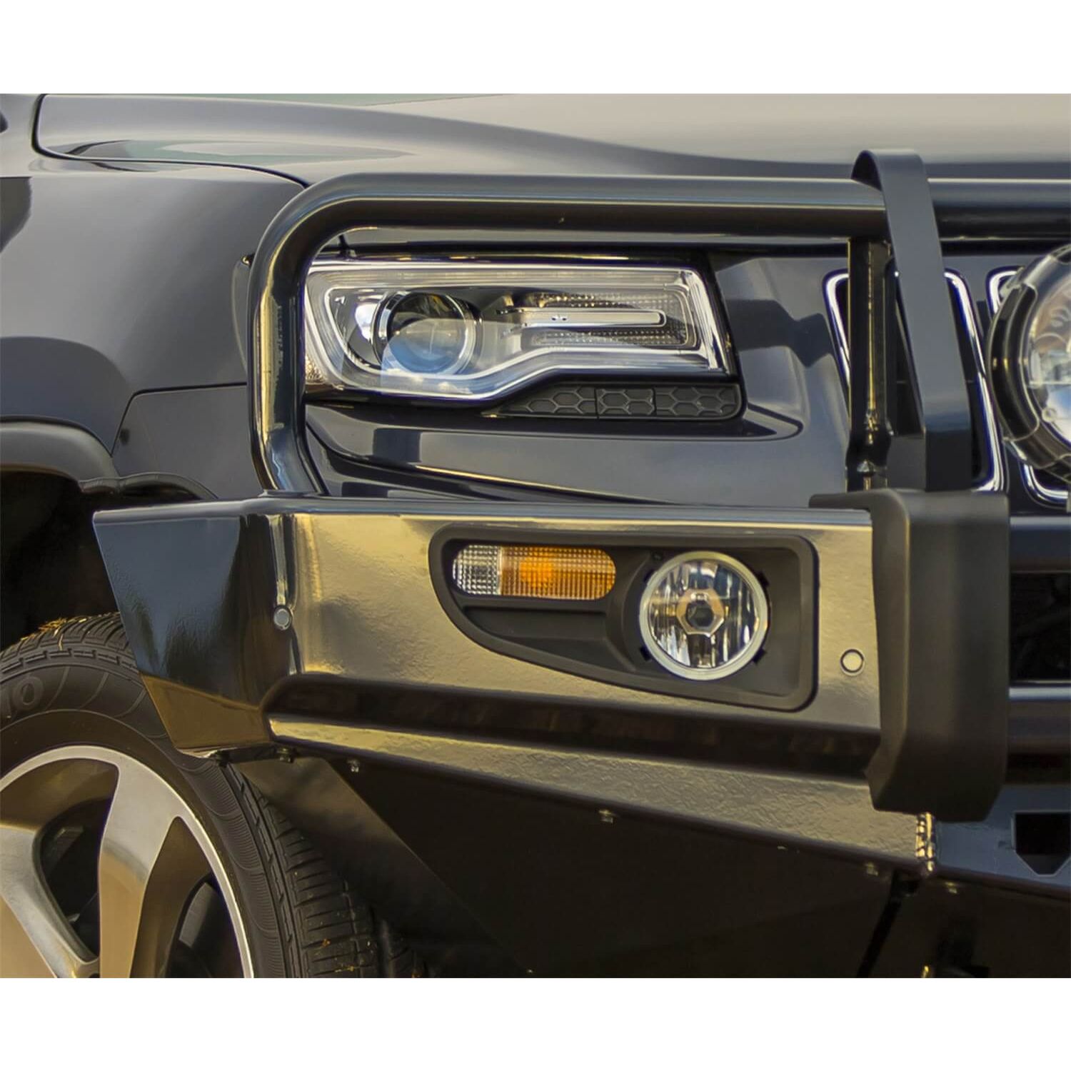 Designed to fit the 2014-2016 Jeep Grand Cherokee 4×4 models, the ARB Deluxe Bar has been engineered and developed from the ground up. With various engine and model variations within the vehicle model line-up, ARBs engineers scanned different configurations of models within the WK2 Grand Cherokee range to ensure the bumpers fitment to all models 2014 to 2016. The test program for the WK2 bar development included articulation tests to ensure proper bar clearance, rough surface driving, winch load testing, Hi-Lift jack point testing and both low speed suburban and freeway driving. For winch fitment, the 3540050 Winch Install kit is required. This includes a folding license plate bracket, longer power cables and all fasteners required to fit a Warn winch to the bar. Sales staff and customers should be aware that the bar should not be fitted with a winch without this kit as the folding bracket allows the license plate to be positioned in a way that does not affect air flow through the bar.