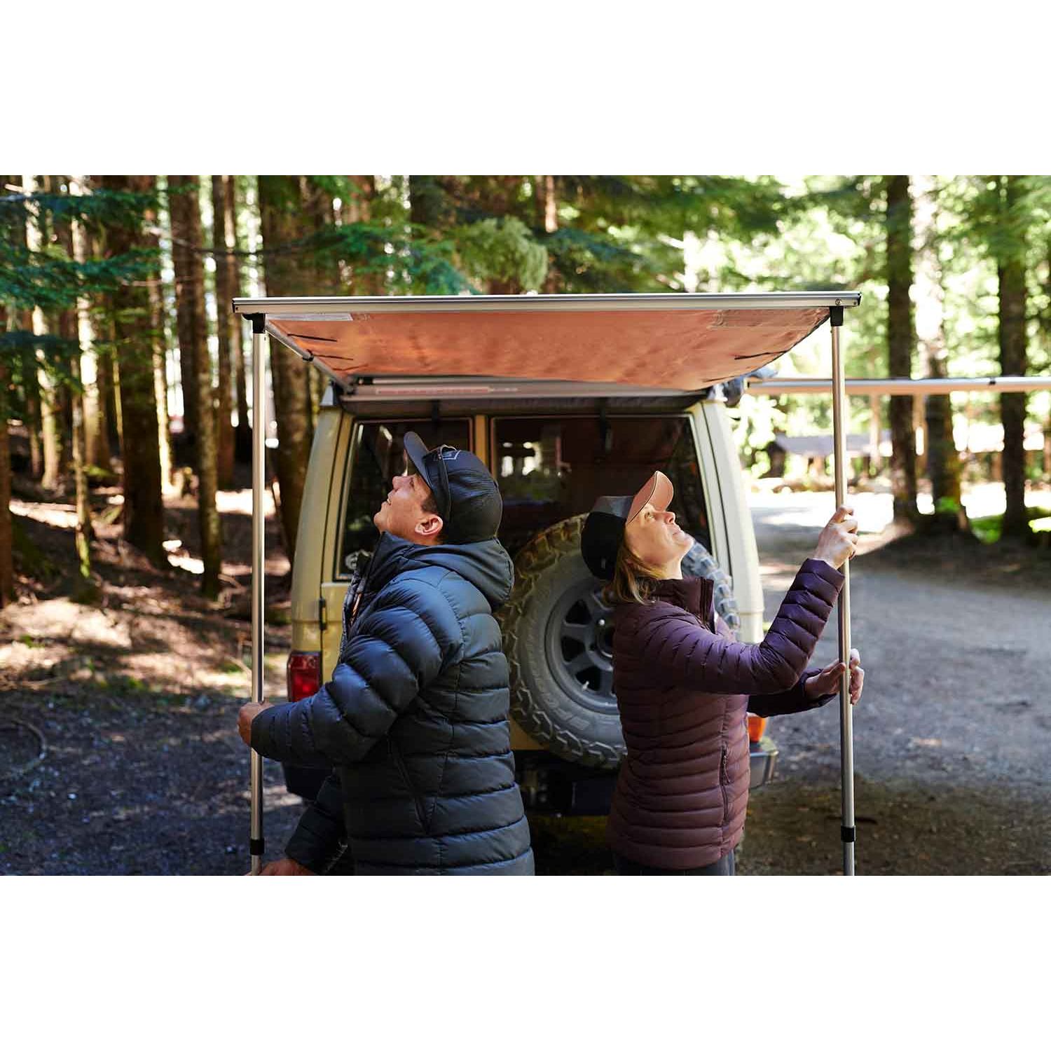 Attaching neatly to most vehicles, these self-standing retractable awnings fit onto the side of most roof racks and roof bars, and are conveniently stored for immediate use on arrival. Specifically designed for harsh wilderness conditions, the awnings feature anodized height adjustable telescopic legs, hook and loop ties to secure roof, thick reinforced aluminum extrusions all secured and free from the outside elements in a heavy duty nylon reinforced bag. Constructed from tough PU coated 300gsm poly/cotton rip stop canvas, the awnings are fully waterproof and offer a UVP 50+ rating. ARB Awnings come in three great sizes, and fit up to 6.9ft (2.1m) high mounting points. (Length being the distance from the vehicle out). Comes with pegs and guy ropes for securing legs, stainless steel mounting nuts and bolts and comprehensive instructions.