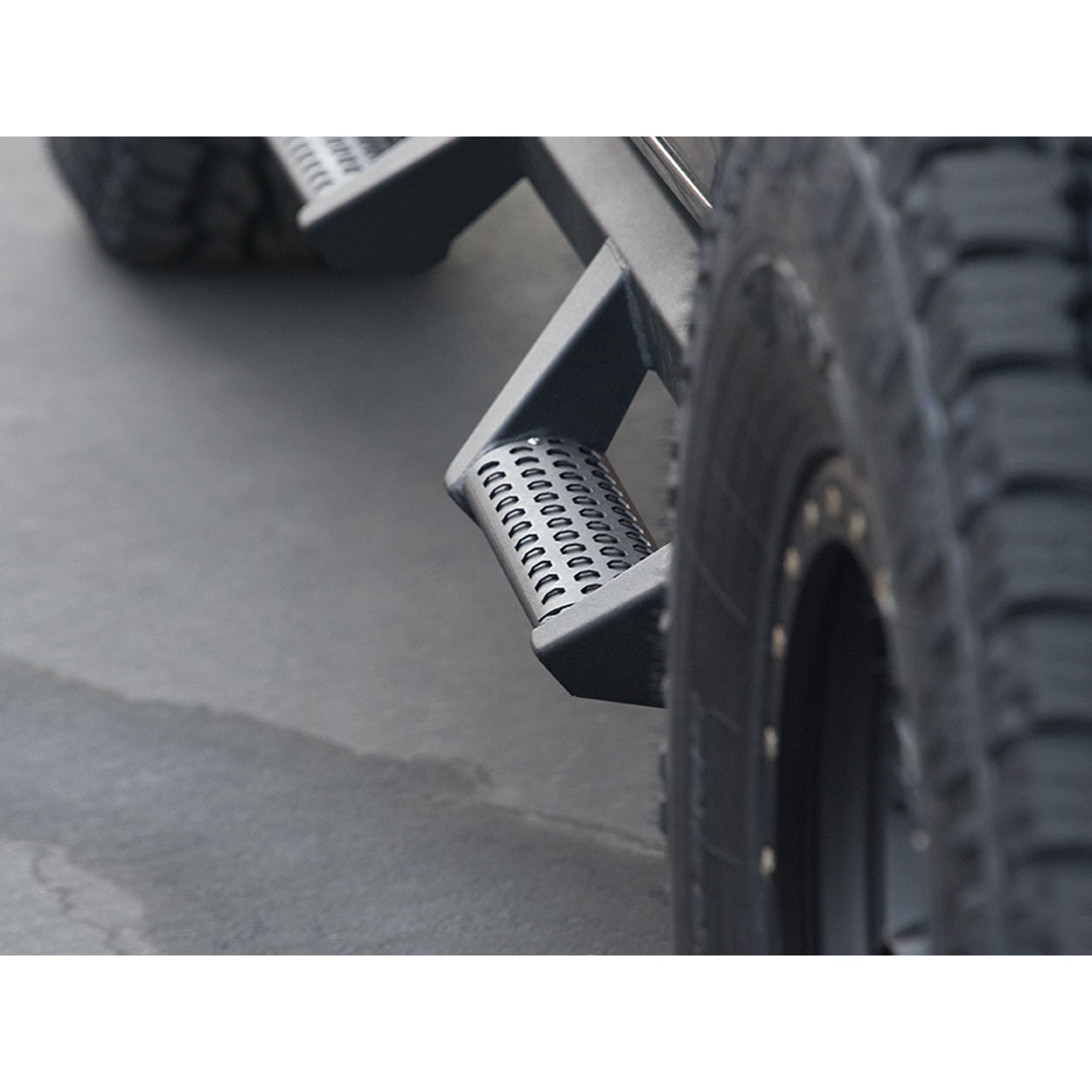 Armordillo 4" oval side step bars from Armordillo will give you the best of both worlds. an ergonomic and attractive design, and a durable construction. Oval shaped for added resistance to bending and flexing, these side steps feature an anti-slip pads for convenient and safe access to your cab in dry and wet weather conditions. Each step is engineered and designed to your exact vehicle specifications, providing an extended tire coverage for more aggressive wheel and tire fitment, so the most accurate fit is guaranteed with no kind of drilling or welding required. Arm your off-road beast with Armordillo, an industry-leading manufacturer of top-of-the-line truck accessories and parts. Years of ingenious engineering and passion for the world's toughest truck has been poured out into providing hardcore off-road products designed to turn your beefy companion into the embodiment of sleekness, edginess, and aggression. The brand offers bull bars, step bars, fender flares, truck bed rails, trailer hitches and some of its unique products. Pre-Runner bumper guards, AR drop steps, lockers, and bull bars. You can count on Armordillo to bring you impeccably strong and durable parts combining brutal appeal with high-end elegance. The brand's bull bars, grilles, fender flares and side step bars are a sure way to instantly give your off-road warrior a more sharp, mean look along with unmatched comfort and protection against the rage of the trails. So, if you are looking to improve your vehicle's stance and fortify its defenses to own the dust with confidence, Armordillo is the answer to all your needs.