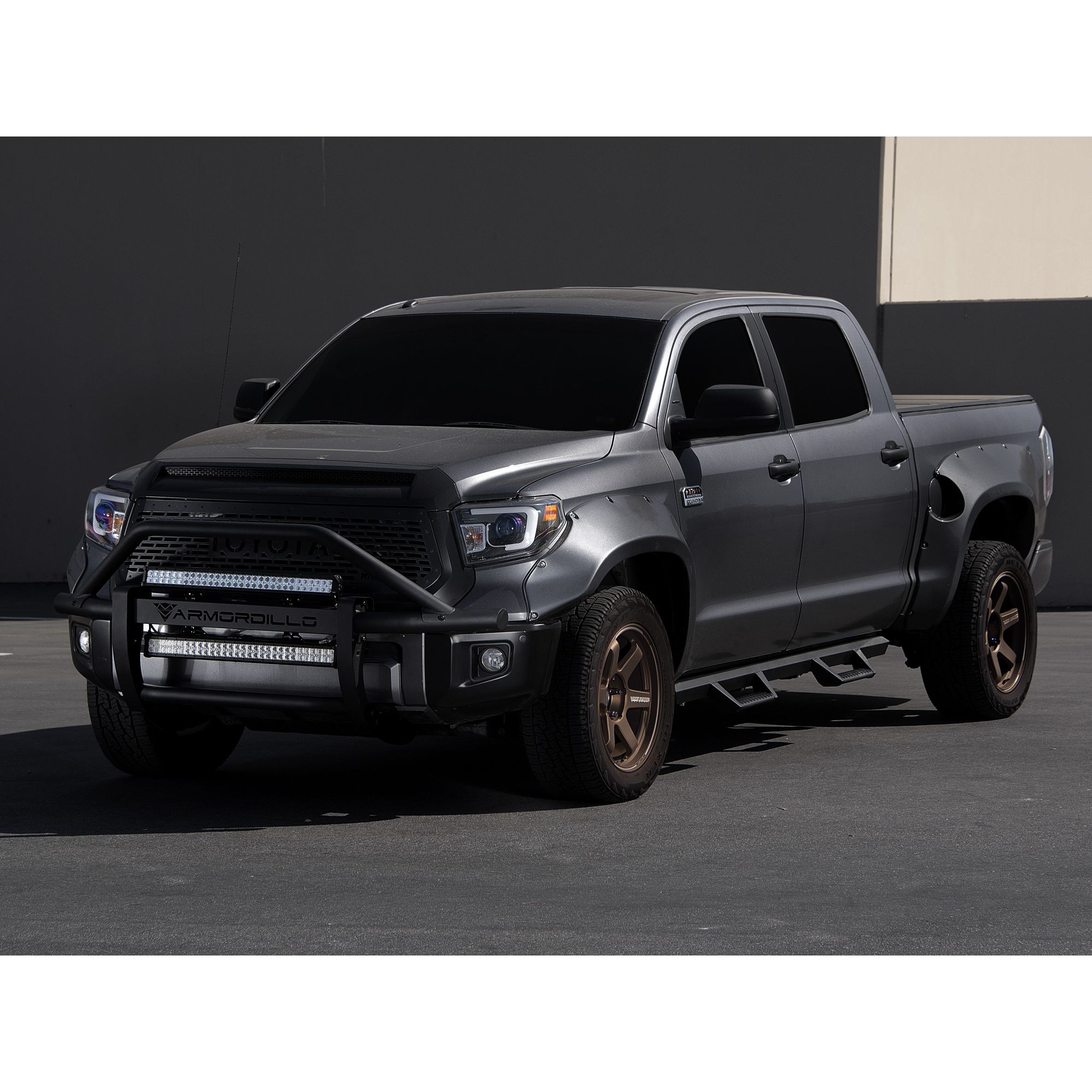 Armordillo AR Pre-Runner Guard is the front-end shield against minor collisions, branches, rocks, and wayward deer. It is composed of a push bar body with 3.5" ID outer tubes to protect your headlight and a cross bar to protect your grille to ensure reliable protection for your front end. It's modular system allows for quick access to your headlights for troubleshooting and maintenance. In addition, the grille guard features AUX light mount holes, making it easy to add a set of auxiliary lights to increase illumination and visibility. The AR Pre-Runner Guard is powder coated to protect from rust and corrosion so you can enjoy the brand-new look of your product for many years to come. Arm your off-road beast with Armordillo, an industry-leading manufacturer of top-of-the-line truck accessories and parts. Years of ingenious engineering and passion for the world's toughest trucks has been poured into providing hardcore off-road products designed to turn your beefy companion into the embodiment of sleekness, edginess, and aggression. The brand offers bull bars, step bars, fender flares, truck bed rails, trailer hitches and some of its unique products. Pre-Runner bumper guards, AR drop steps, lockers, and bull bars. You can count on Armordillo to bring you impeccably strong and durable parts combining brutal appeal with high-end elegance. The brand's bull bars, grilles, fender flares and side step bars are a sure way to instantly give your off-road warrior a more sharp, mean look along with unmatched comfort and protection against the rage of the trails. So, if you are looking to improve your vehicle's stance and fortify its defenses to own the dust with confidence, Armordillo is the answer to all your needs.