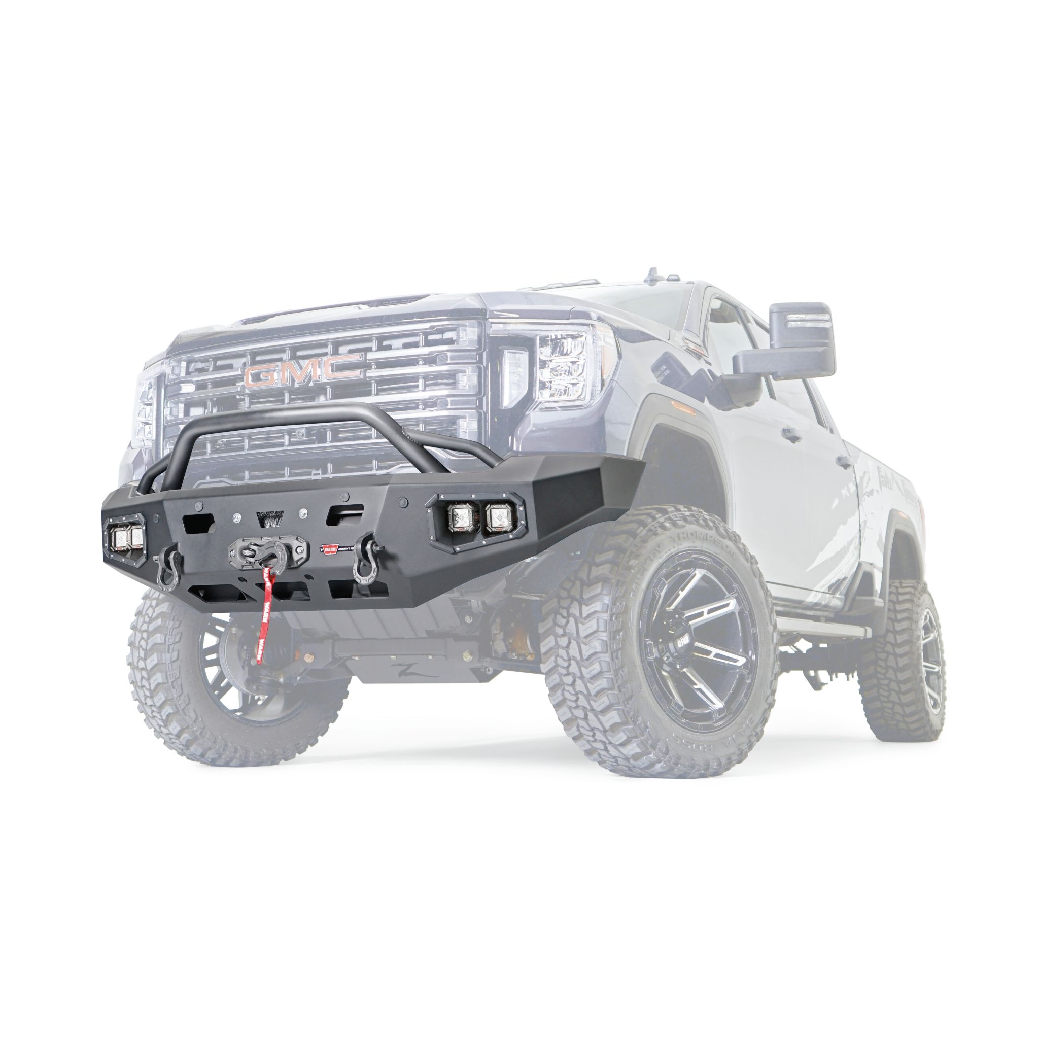 WARN Ascent HD front bumper for GMC 2500/3500 featuring a pre-runner style grille guard and integrated winch mount that will accept large or mid-frame winches up to 18,000 lbs in capacity.