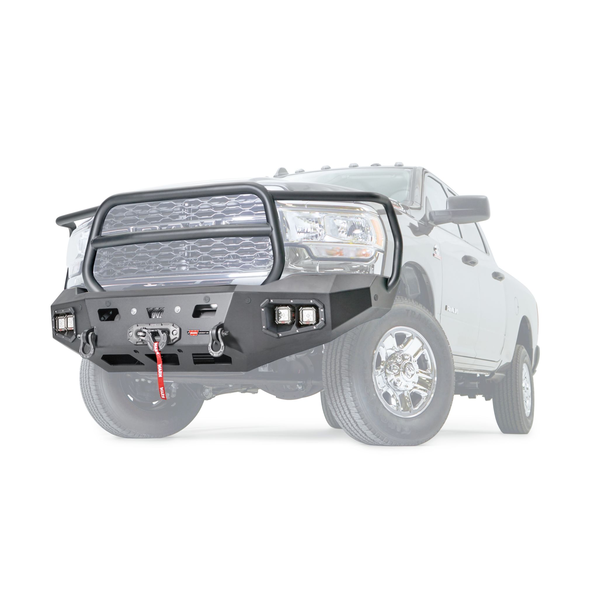 WARN Ascent HD front bumper for RAM 2500/3500 featuring a full grille guard and integrated winch mount that will accept large or mid-frame winches up to 18,000 lbs in capacity.