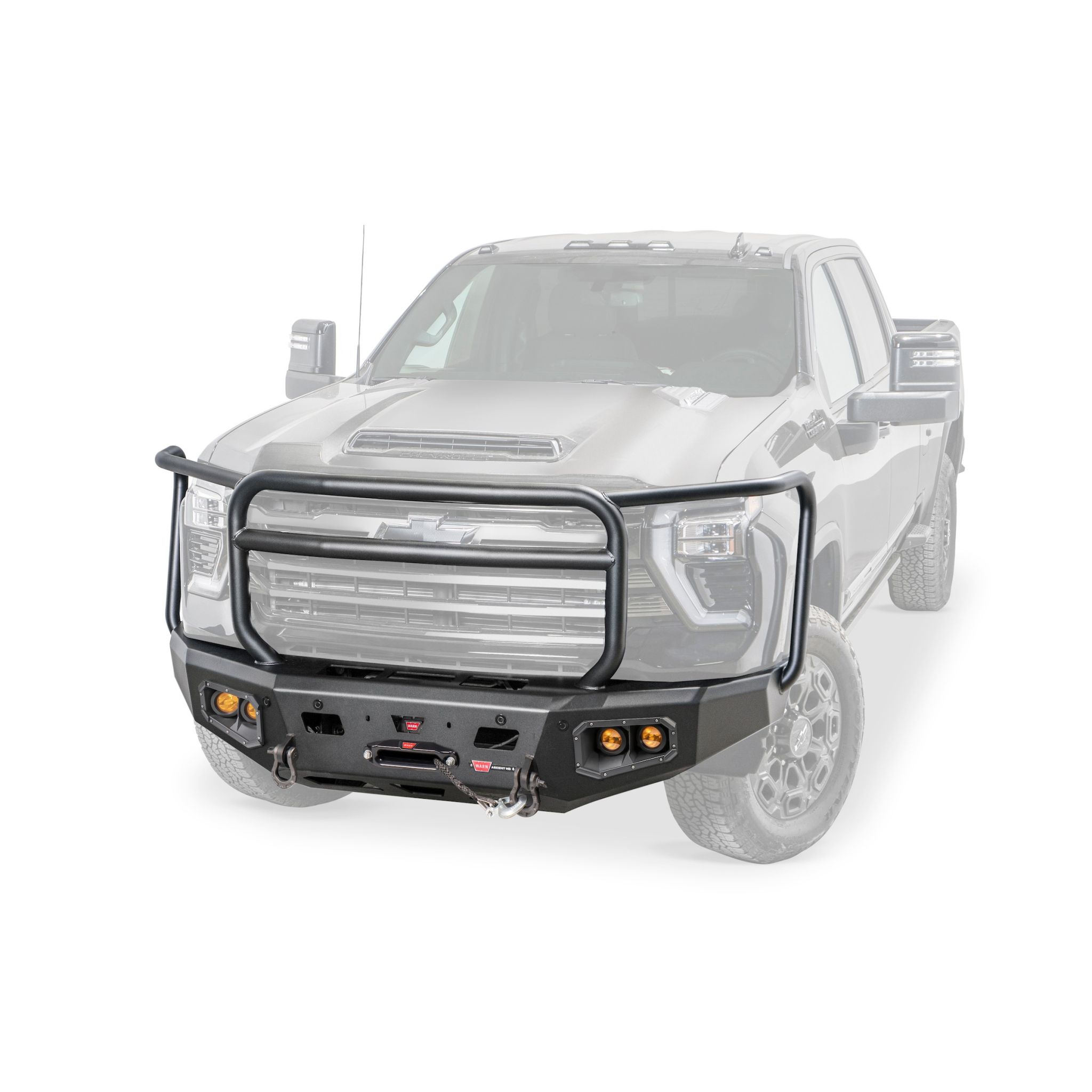 WARN Ascent HD front bumper for Chevrolet Silverado 2500HD and 3500HD featuring a pre-runner style grille guard and integrated winch mount that will accept large or mid-frame winches up to 18,000 lbs in capacity.
