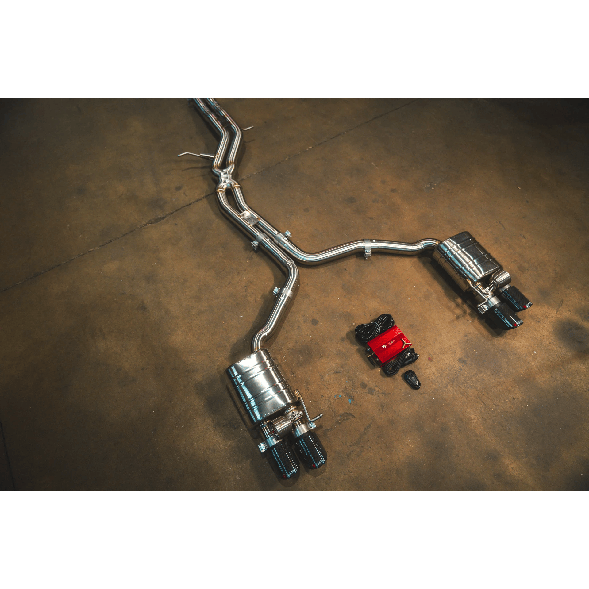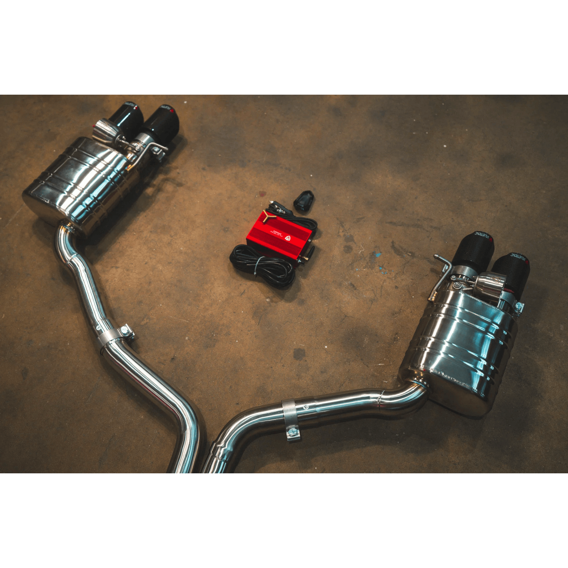 What is Included: Valved exhaust system, Integrated high-pitch X-pipe, Vacuum-actuated valves with key fob control system, and black Valvetronic tips