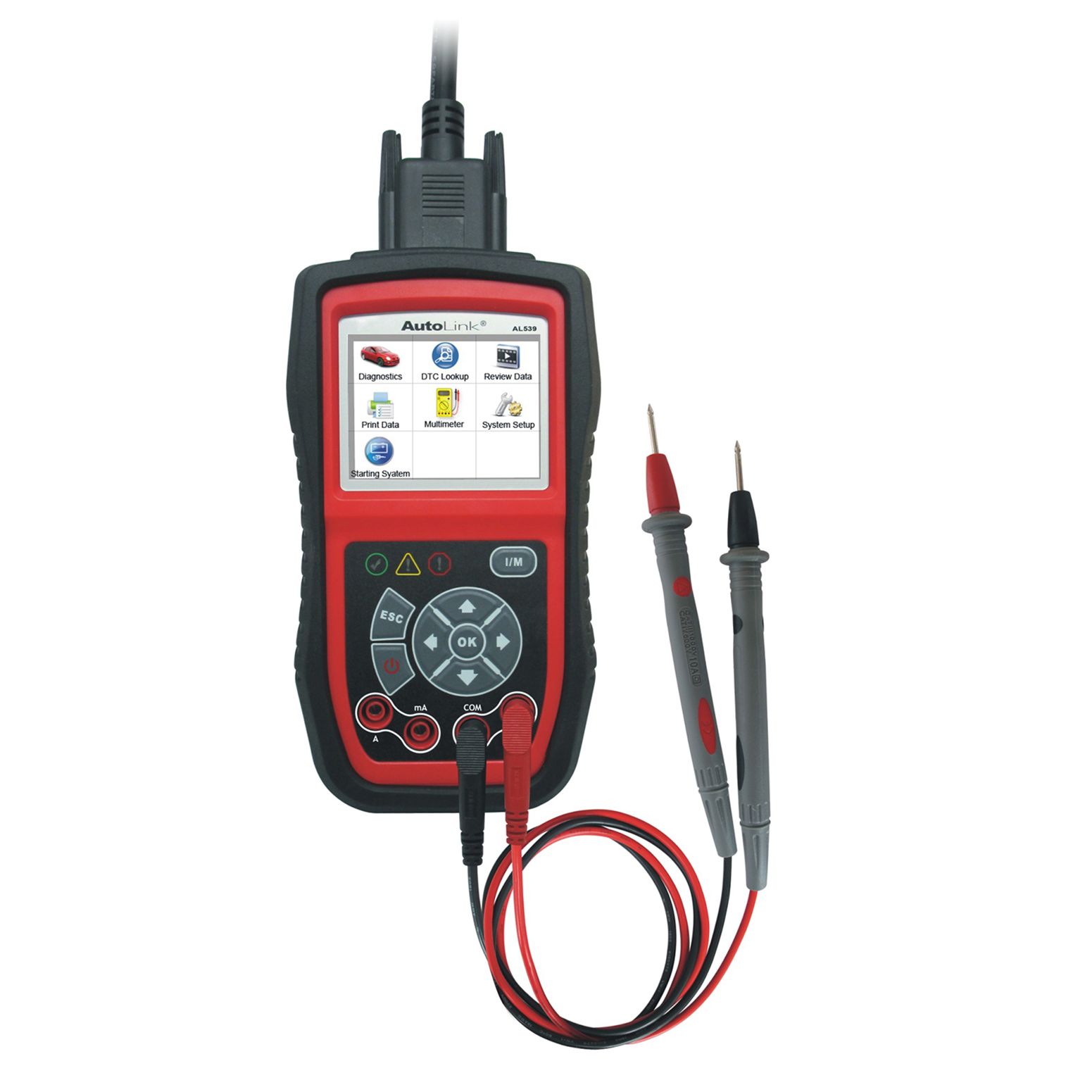 The AutoLINK AL539 is an engine code reader and electrical testing tool. It can read and erase engine codes, display live and freeze frame data, supports all 10 OBDII test modes, and has one-click I/M readiness/emissions testing. An OBDII cable, voltage test probes and an AVO meter are included for testing the starting, circuit, voltage, continuity, current, and charging systems. It is updatable via PC, and a 1-year tool warranty and free lifetime software updates are available with purchase.