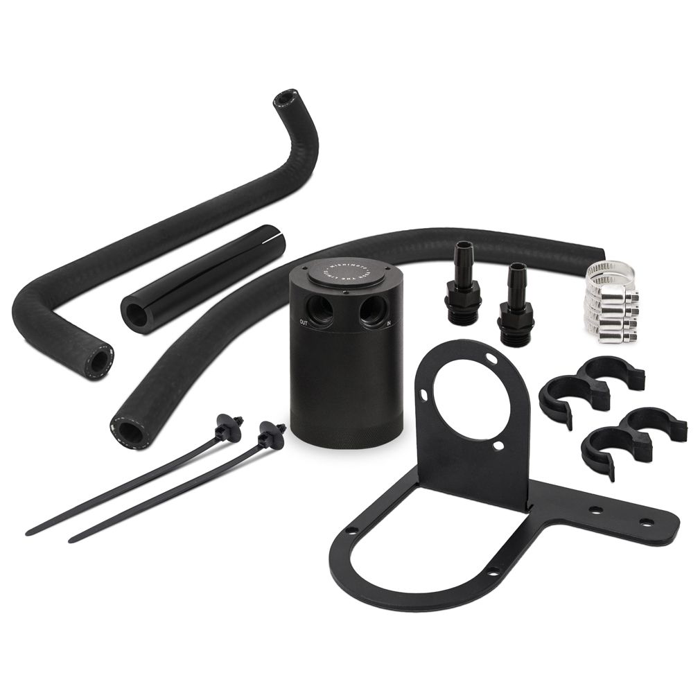 TechSpec Includes: (1) Compact Baffled Oil Catch Can–(2) Direct Fit Hoses–(1) Application-Specific Mounting Bracket–(2) 3/8-in Aluminum Fittings–(4) Worm Gear Clamps–(2) Tree Clip Zipties–(1) Split Hose–(2) Hose Clips–Mounting Hardware–Mishimoto Lifetime Warranty