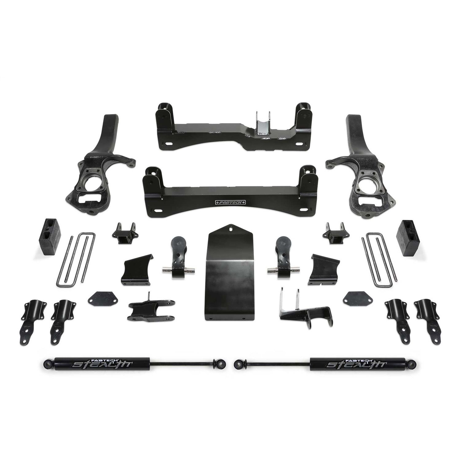 The Chevrolet Trail Boss and GMC AT4 both have a factory 2 in. lift compared to other GM 1500 trucks of the same year model. Fabtech's suspension system for these two trucks provide a 4 in. lift height on top of the factory 2 in. lift for clearance of 35 in. tall tires. Once a Trail Boss or AT4 is lifted with a Fabtech 4 in. system, the truck will sit the same height as a 1500 with a 6 in. suspension and 35 in. tires. Fabtech's suspension design for the Trail Boss and AT4 provides excellent drive ability both on and offroad. There is zero bump steer throughout the suspension cycle that helps reduce drive fatigue while improving the overall drive ability of the vehicle. The near stock track width keeps the tires under the fenders for a clean appearance. Fabtech's proprietary steering knuckle geometry provides excellent lock to lock turning radius to maneuver in tight spots. Heavy duty 1/4 in. thick steel crossmembers feature OE style alignment cam pins that utilize the factory cams for easy adjustment. Triple front diff mounts reposition the differential for vibration free operation at high speed. The factory Trail Boss and AT4 coilover shocks are retained and relocated from the bottom to allow for full steer while achieving 4 in. of lift. Rear lift is accomplished by removing the factory 2 in. block and replacing it with a 5 in. block and u-bolt system. Fabtech has addressed all aspects of the Trail Boss suspension for proper wheel travel and lock to lock steering without over cycling. Comes with a free 5 year 60,000 mile Powertrain Warranty.