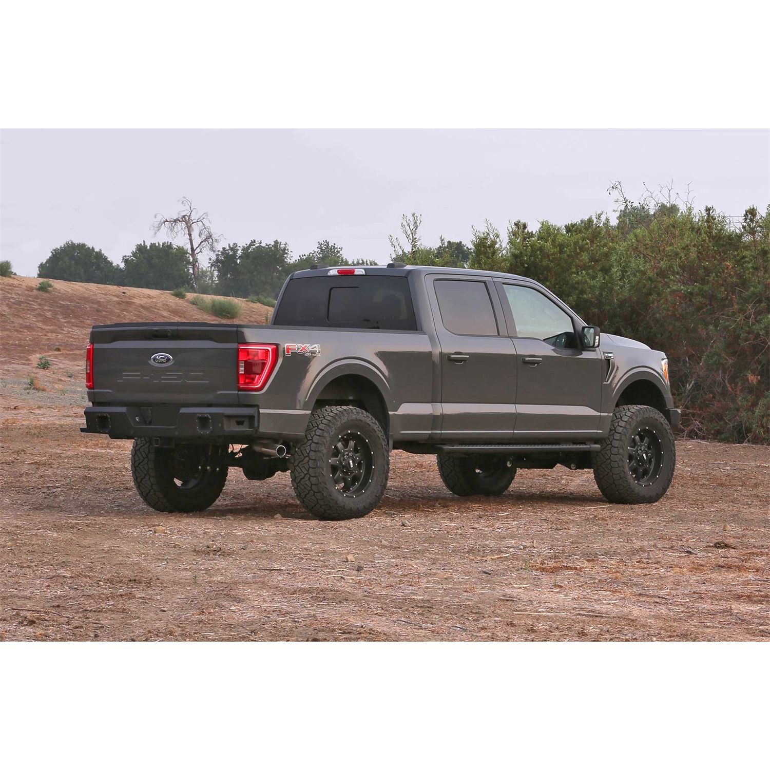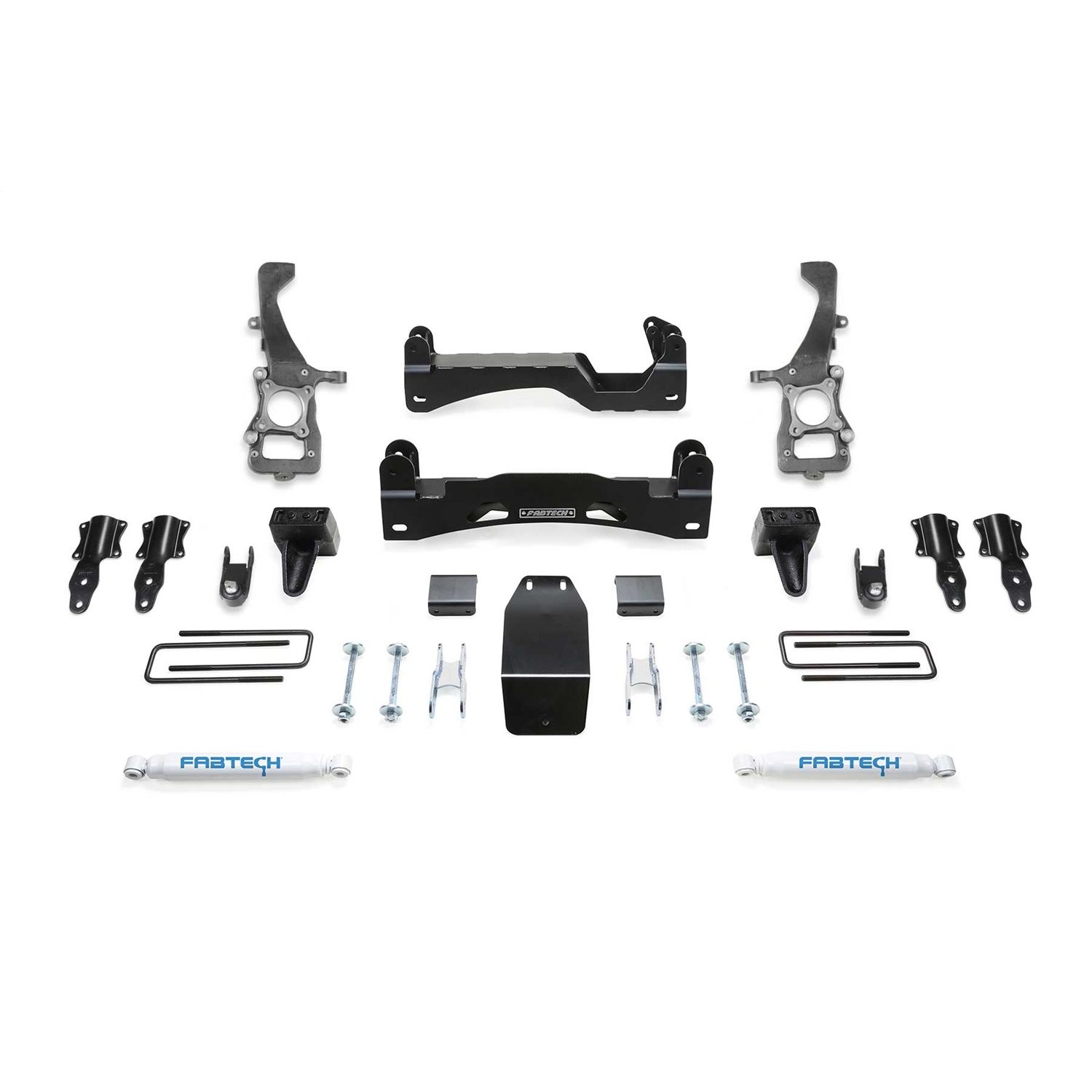 Fabtech's world-renowned IFS suspension design for the Ford F150 provides excellent drive ability both on and off-road. There is zero bump steer throughout the suspension cycle that helps reduce driver fatigue while improving the overall drive ability of the vehicle. The near-stock track width keeps the tires under the fenders for a clean appearance. Fabtech's proprietary steering knuckle geometry provides an excellent lock to lock turning radius to maneuver in tight spots. Heavy-duty 1/4 in. thick steel crossmembers feature eccentric style alignment cams for easy adjustment. Triple front diff mounts reposition the differential for vibration-free operation at high speed. The factory coilover shocks are relocated from the bottom to allow for full steering while achieving 6 in. of lift. At the rear of the vehicle, the factory 2 in. block is replaced with a 5 in. Block and U-bolt system. Fabtech has addressed all aspects of the suspension for proper wheel travel and lock to lock steering without over cycling. For added confidence, this lift comes with a free 5-year 60,000-mile Powertrain Warranty.